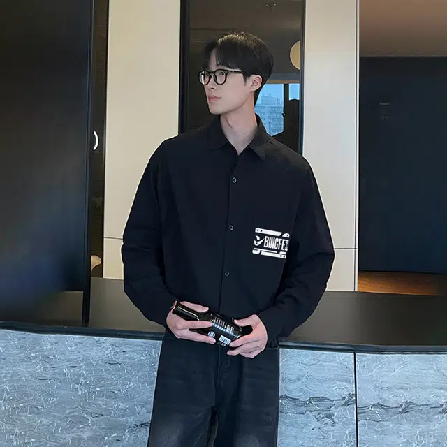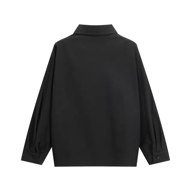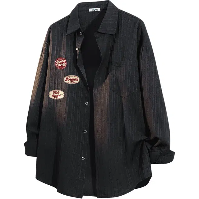 Рубашка 冰飞 美式复古无性别主义风皮标字母印花简约工装口袋上衣外套美拉得色慵懒感叠穿外穿宽松休闲单排扣翻领垂感长袖衬衫 男女同款