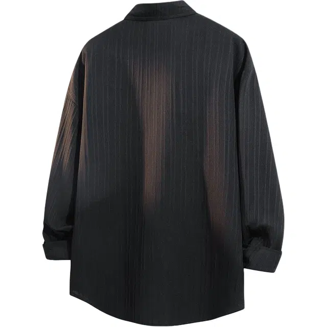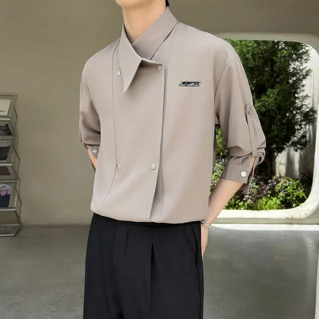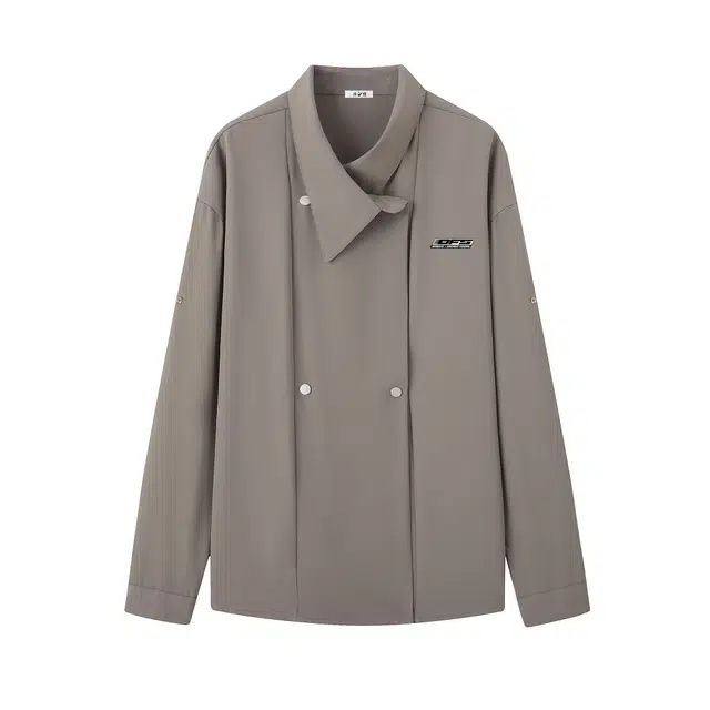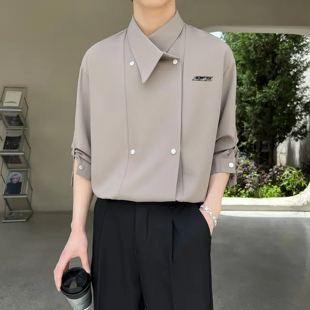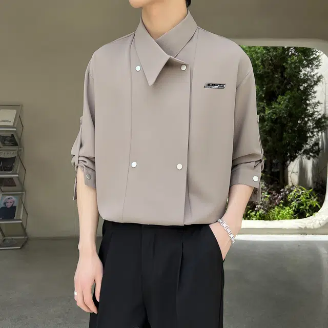 Рубашка 冰飞 韩系双排扣设计感纽扣装饰褶皱感宽松休闲百搭复古冰丝外套垂感舒适透气凉感痞帅随性慵懒长袖衬衫 男女同款