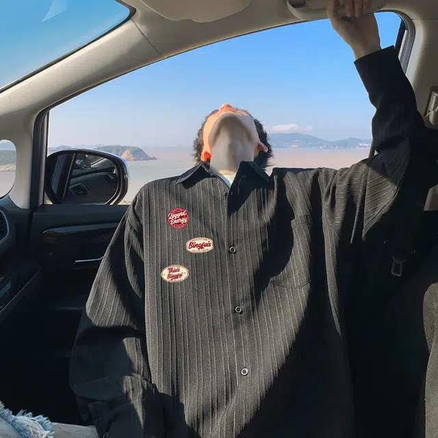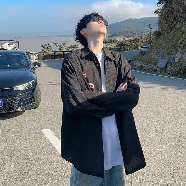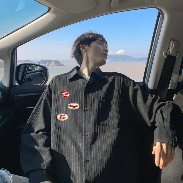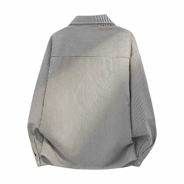 Рубашка 冰飞 美式复古港风日系格纹简约工装口袋上衣外套美拉德色慵懒感学院风叠穿外穿宽松休闲垂感显瘦翻领单排扣长袖条纹衬衫 男女同款