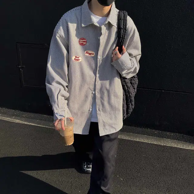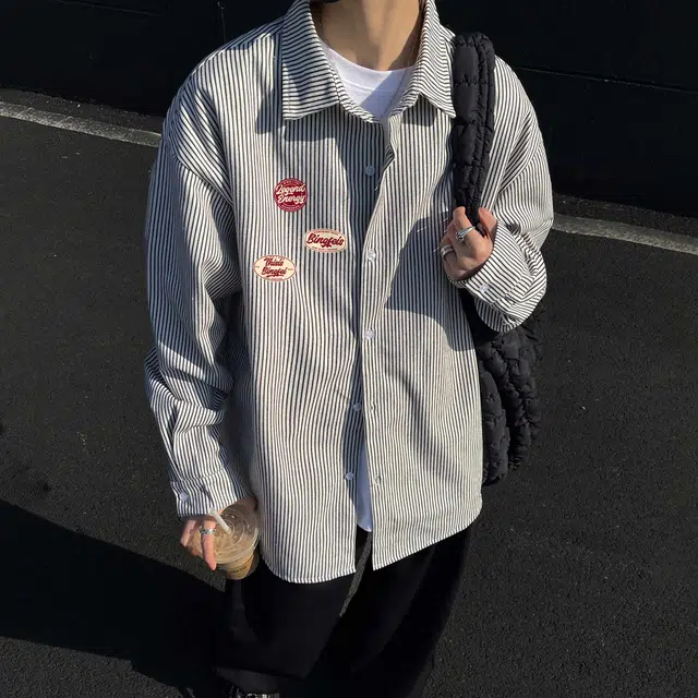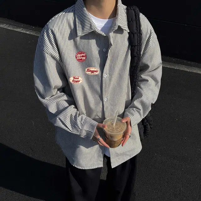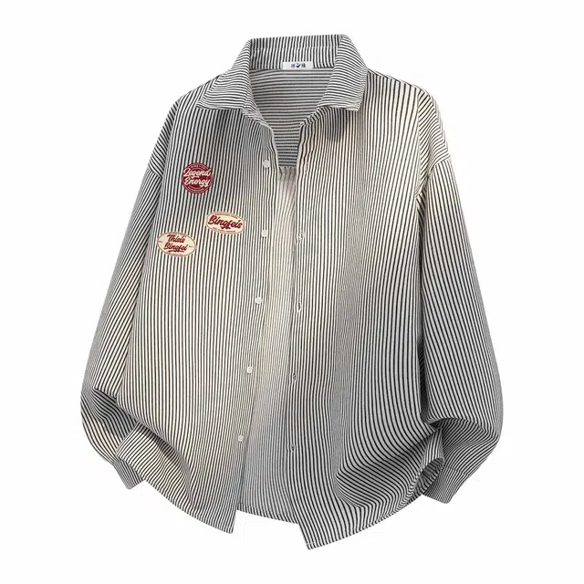 Рубашка 冰飞 美式复古高级感花体字签名字母图案印花宽松休闲舒适通勤百搭撞色翻领慵懒风内搭外套潮牌潮流经典款条纹长袖衬衫 男女同款