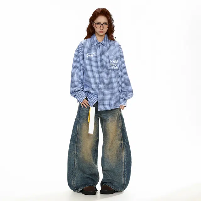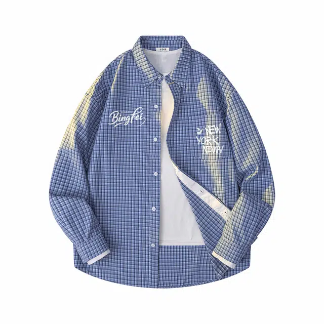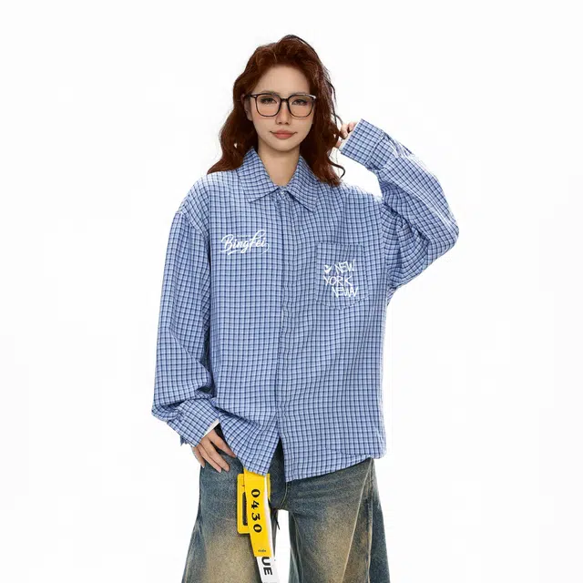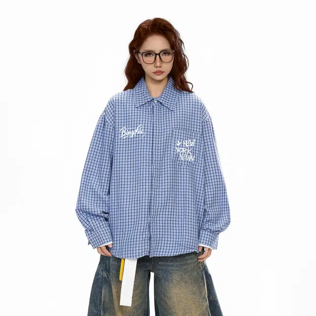 Рубашка 冰飞 美式复古字母印花学院风简约格纹翻领格子衫日常休闲户外通勤百搭设计感长袖衬衫 男女同款