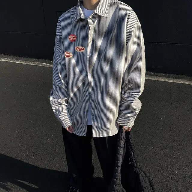 Рубашка 冰飞 美式复古高街拼接撞色小竖条手写字母印花宽松休闲户外运动潮牌百搭通勤叠穿简约免烫翻领纽扣长袖衬衫 男女同款