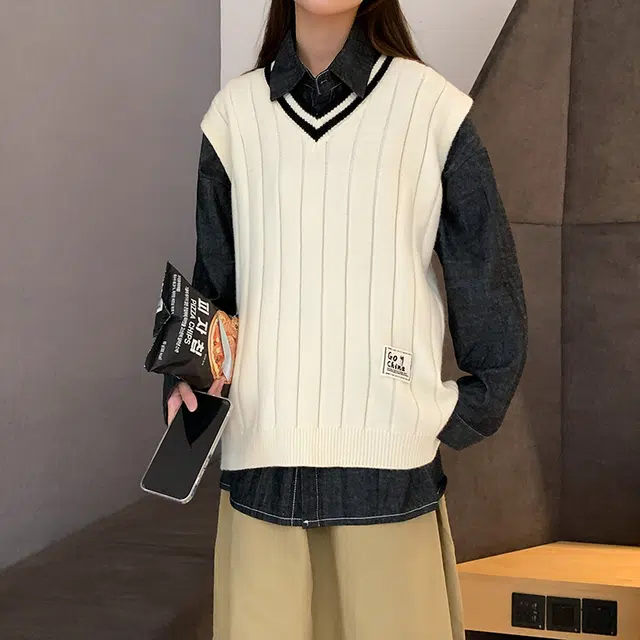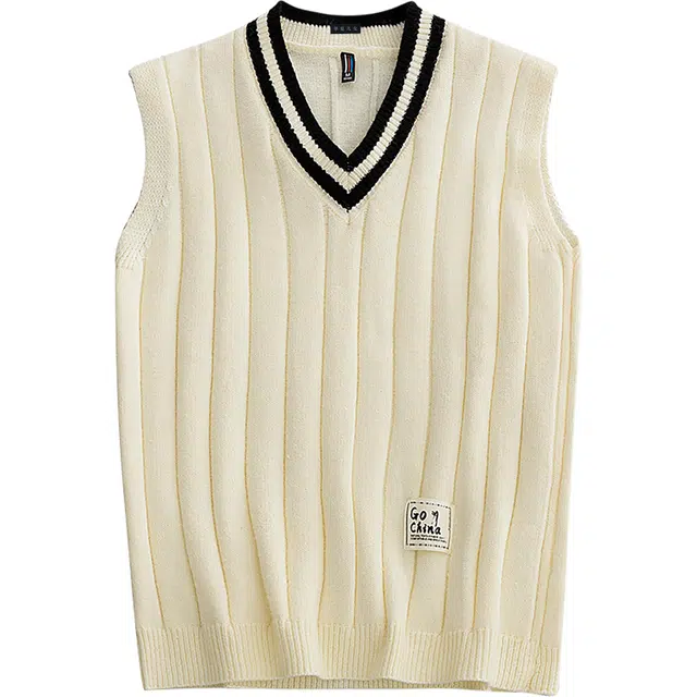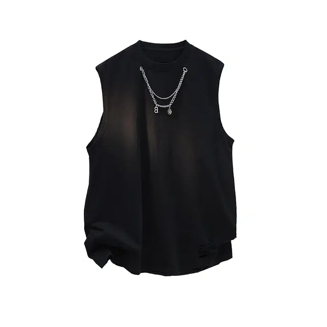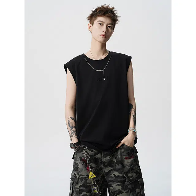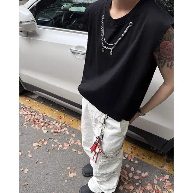 华夏儿女 美式高街自带项链款双领下摆破洞设计通勤百搭重磅纯棉透气宽松无袖坎肩搭配水洗做旧直筒休闲背心 男女同款