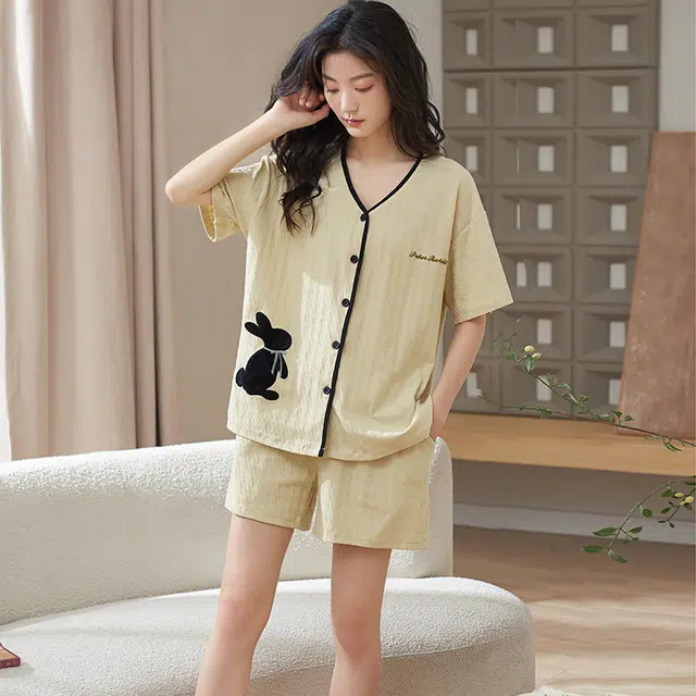 小情歌 家居服睡衣 短袖短裤睡衣女夏季家居服女夏款纯棉家居套装 千鸟格压纹兔子图案刺绣设计 女款 白色