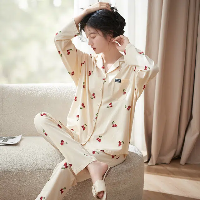 小情歌家居服睡衣 纯棉长袖长裤开衫套装 睡衣女夏季 女款 米黄色
