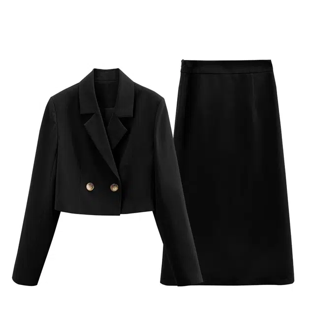 苏醒的乐园 纯色西装领外套修身格纹高腰吊带连衣裙裙装套装 女款 黑色