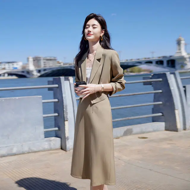 苏醒的乐园 通勤纯色西装领长袖薄款上衣宽松短裙两件套裙装套装 女款 米色