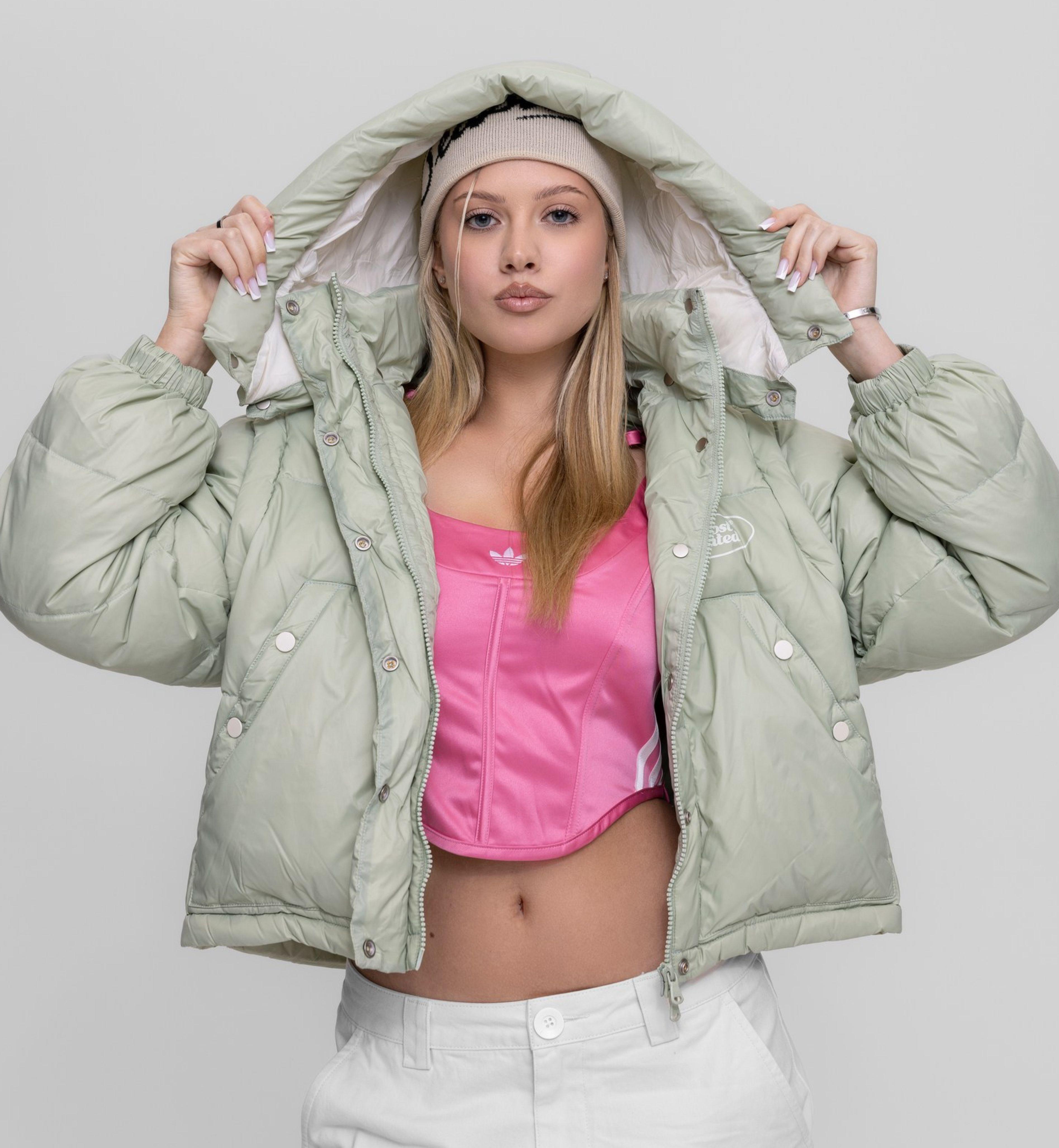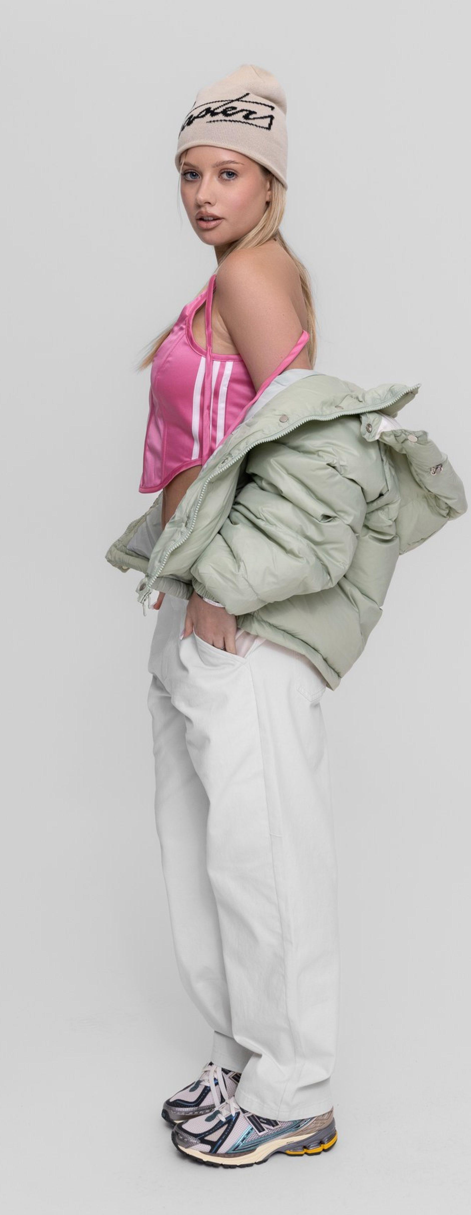 Женский образ с яркими акцентами. Мятный пуховик и розовый топ создают контрастный, но гармоничный лук. Белые широкие брюки добавляют лёгкости, а шапка с принтом завершает образ с нотками молодёжной дерзости.