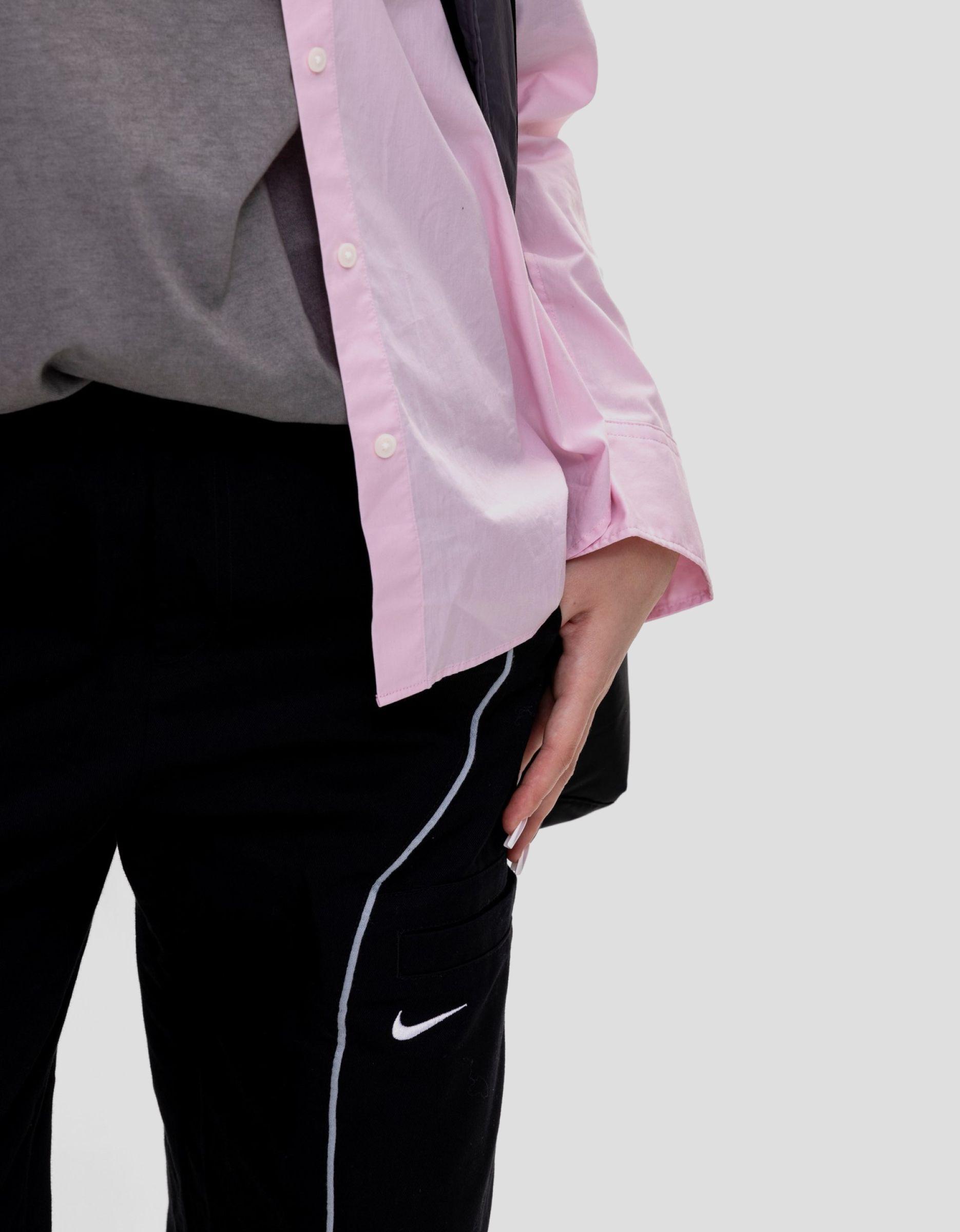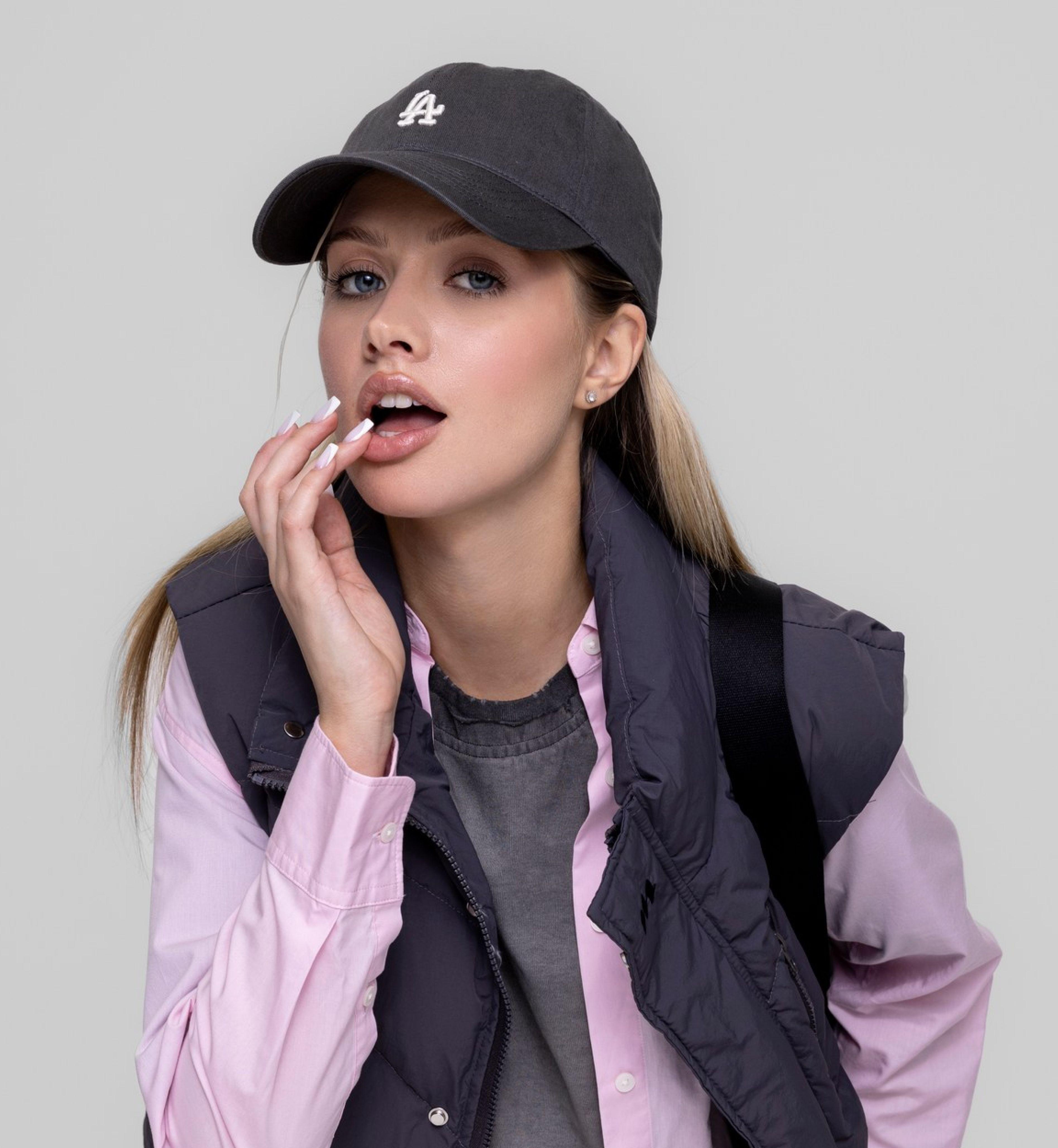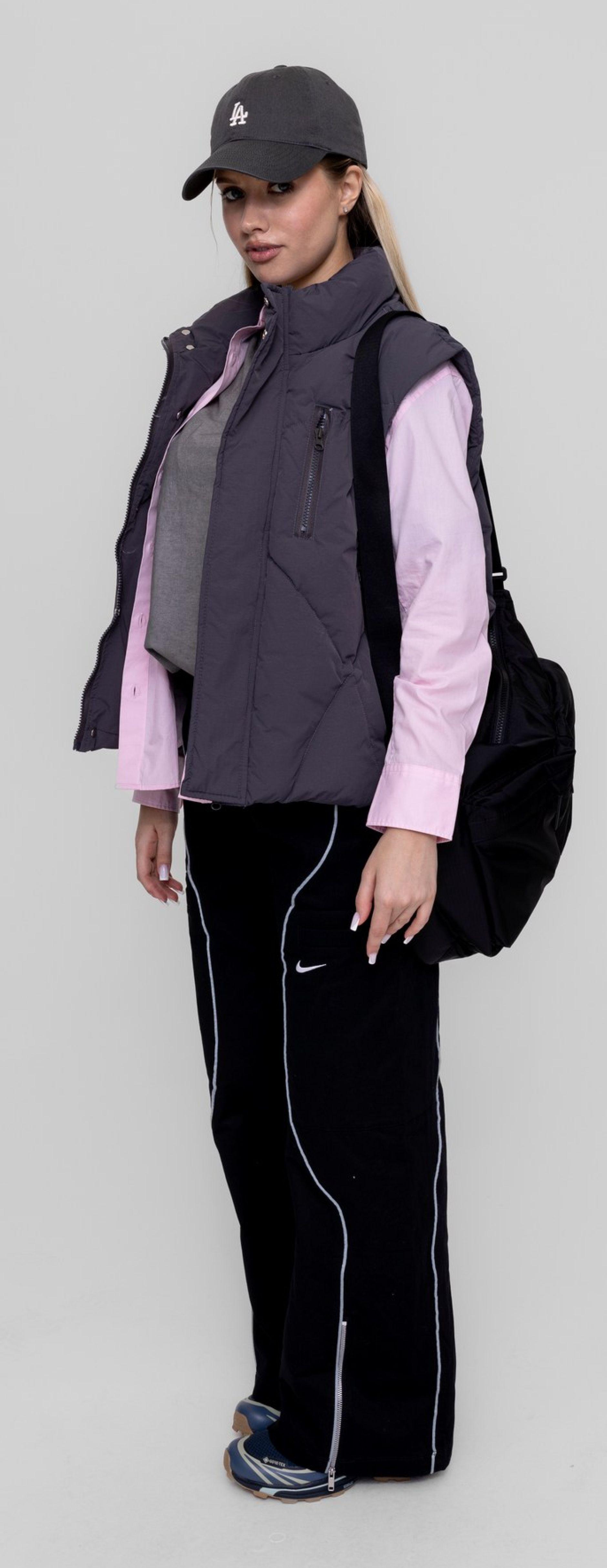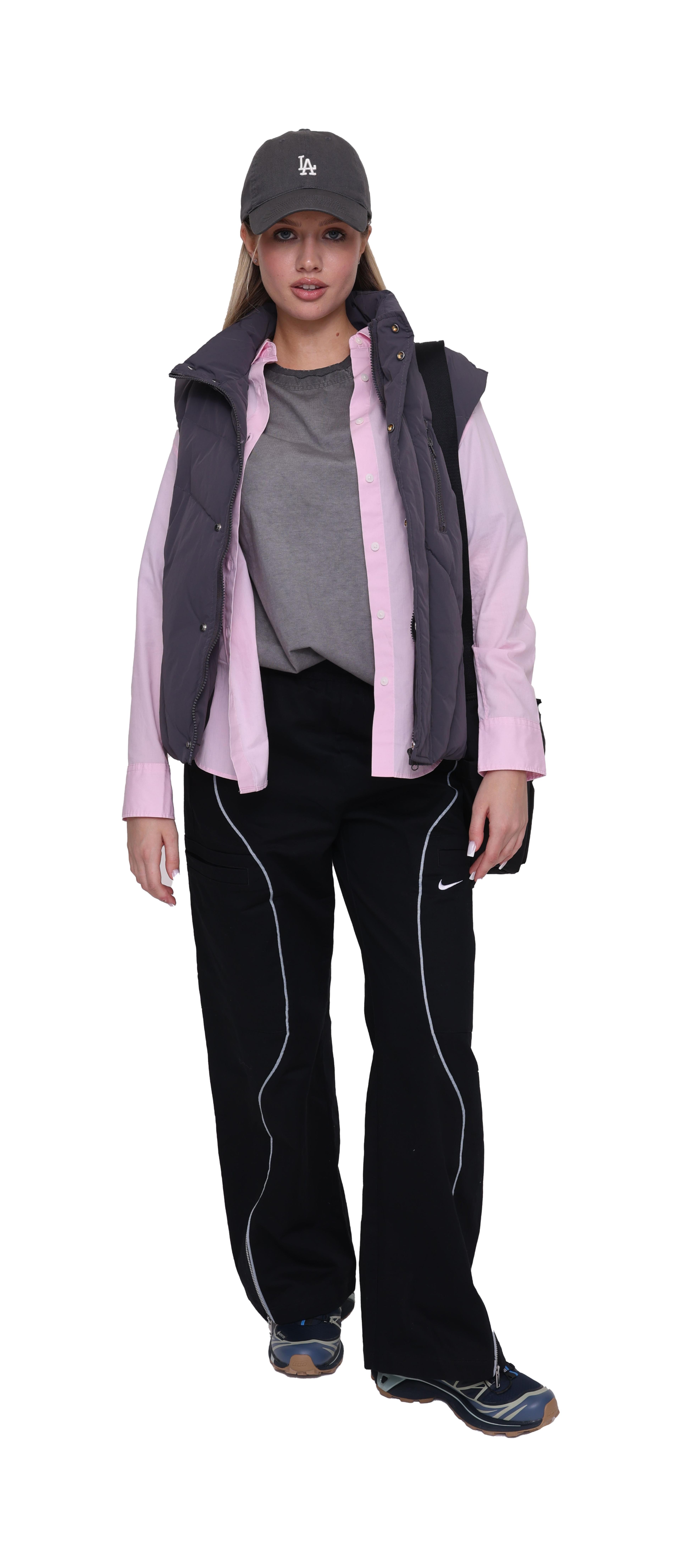 Женский многослойный образ. Уютный и продуманный. Сочетание серой футболки, розовой рубашки и жилета в тёмных тонах создаёт стильный многослойный образ. Чёрные брюки с белыми вставками и бейсболка добавляют динамики, делая сет универсальным для активного дня.