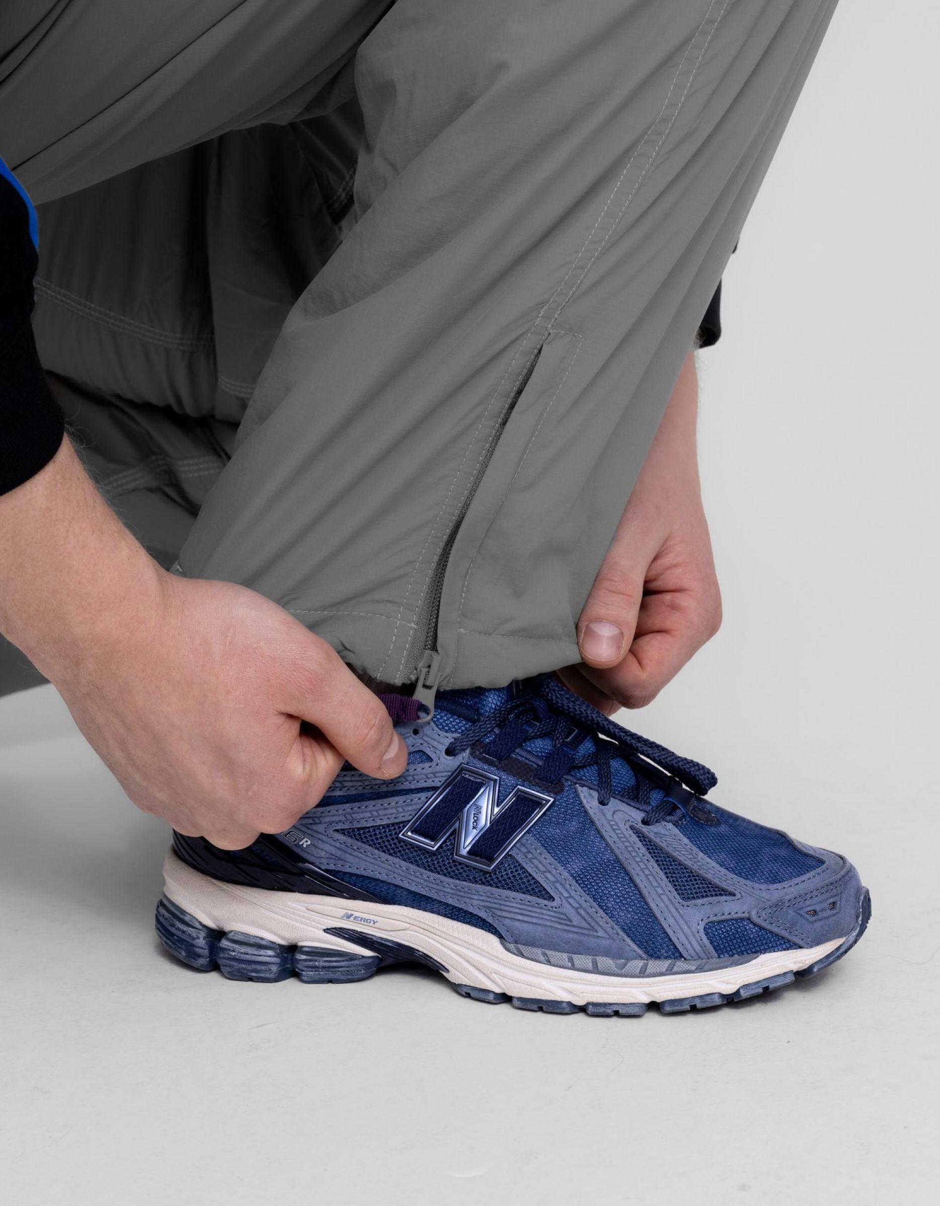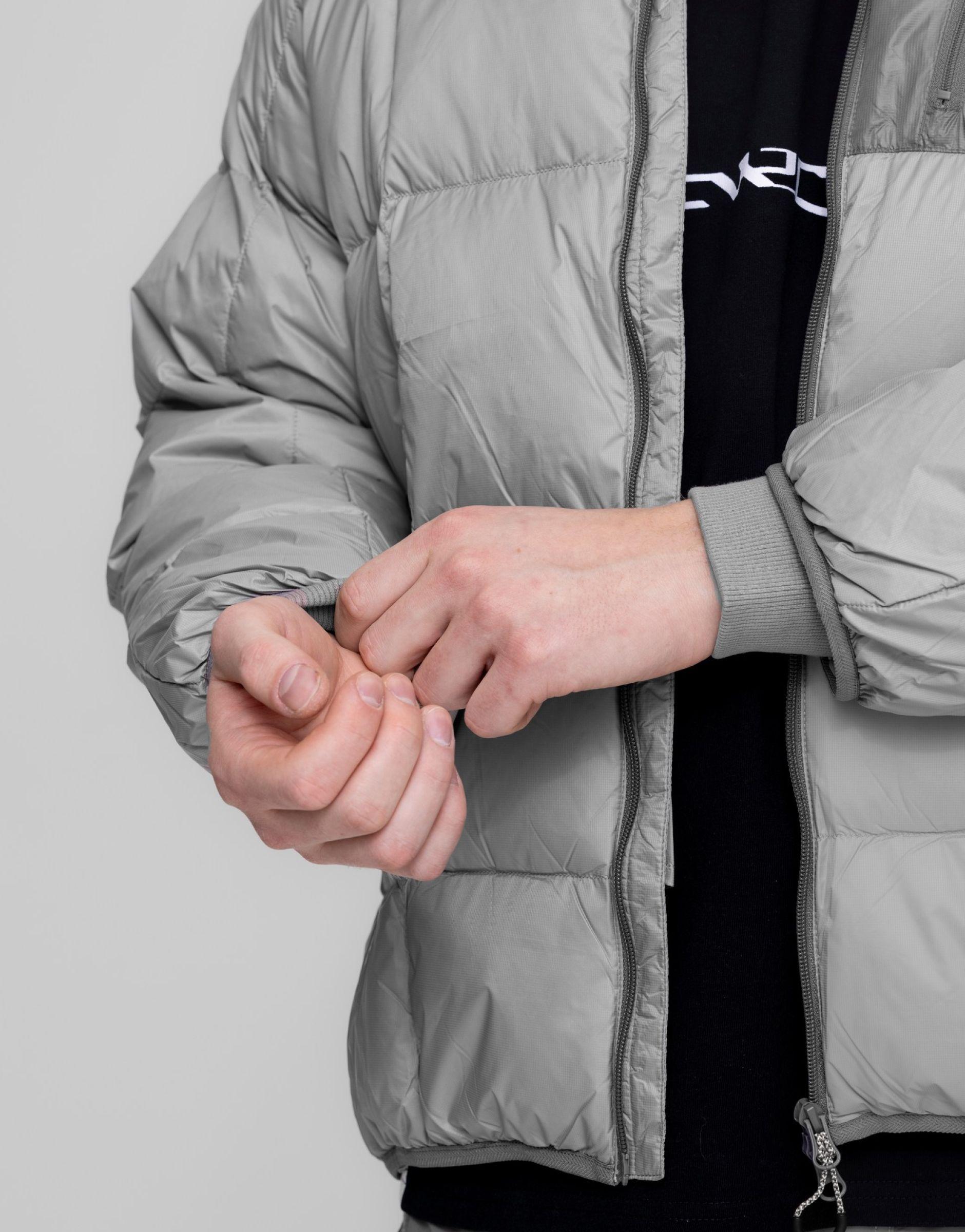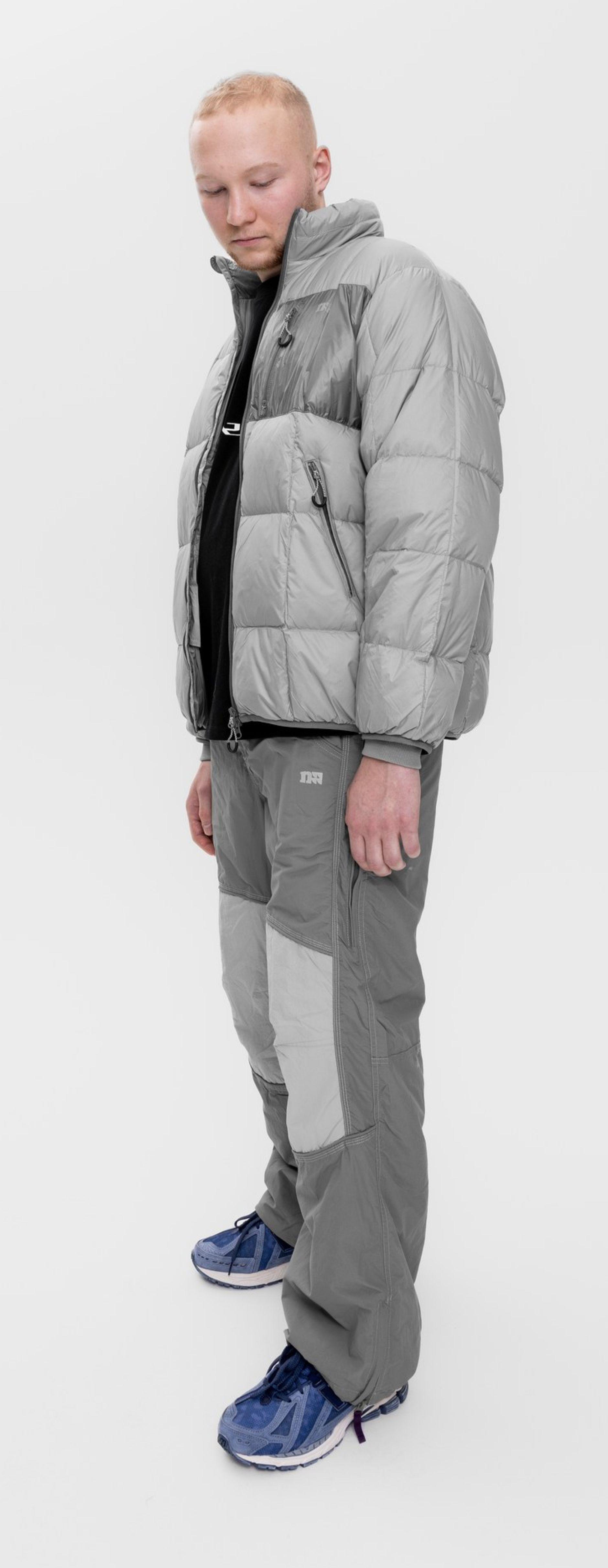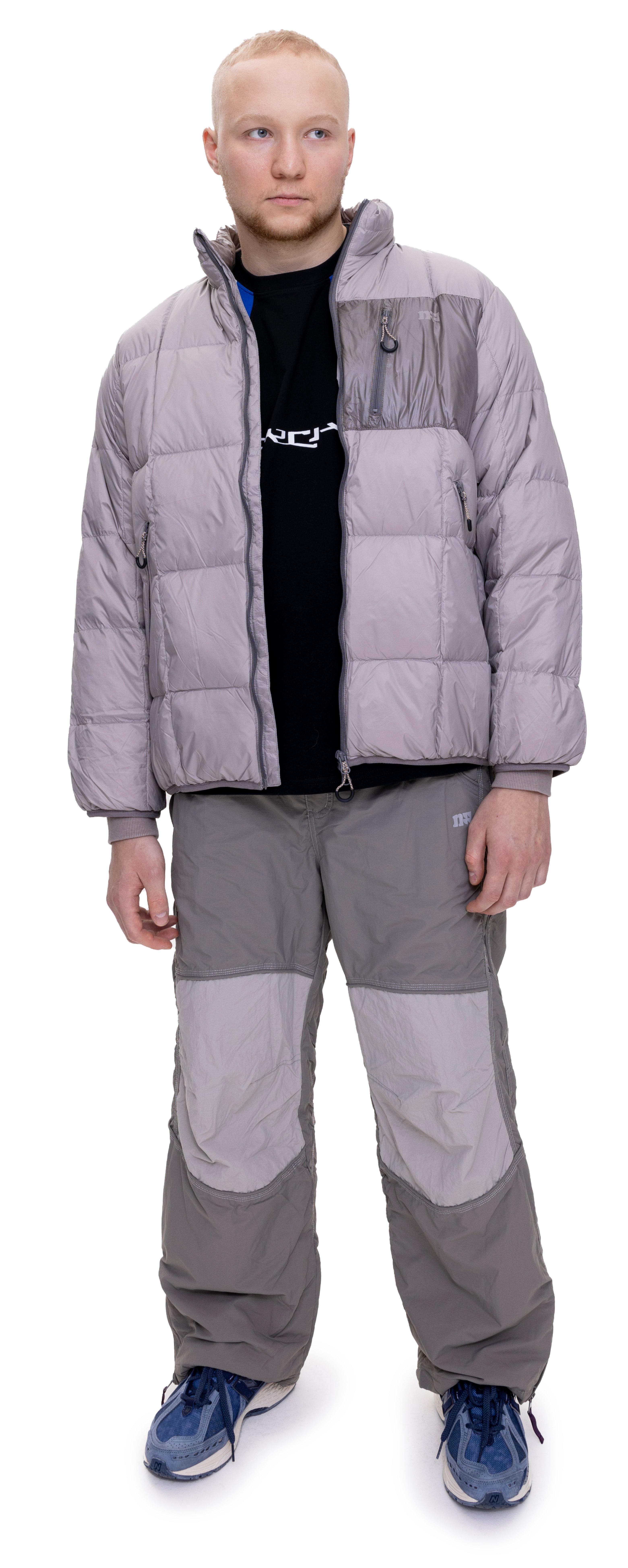 Серый стёганый пуховик создаёт уютную основу, а чёрный свитшот добавляет глубины образу. Контрастные брюки с серыми вставками подчёркивают современный и функциональный стиль. Завершает образ пара синих кроссовок, добавляя акцент и делая сет универсальным для зимних прогулок или активного отдыха.