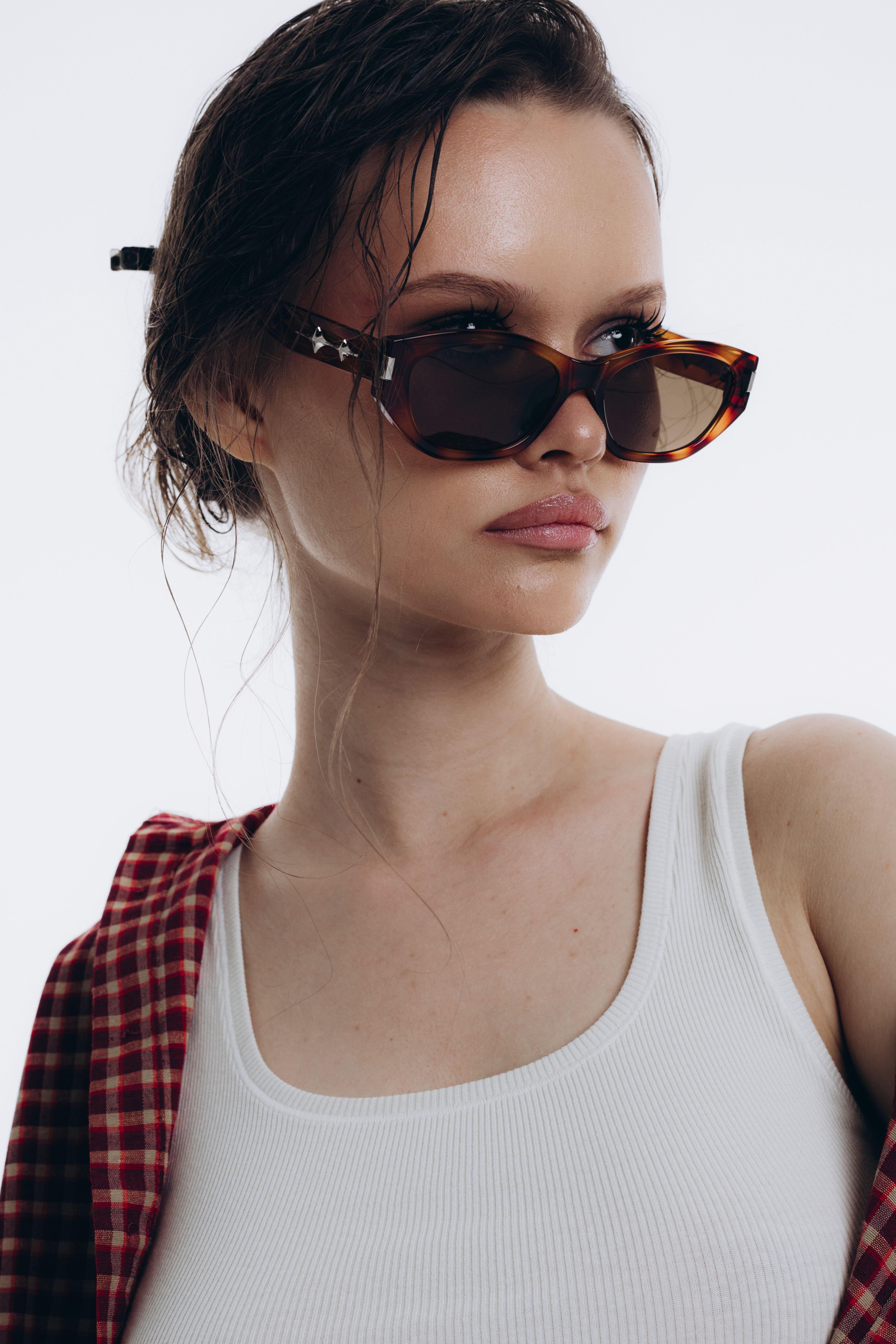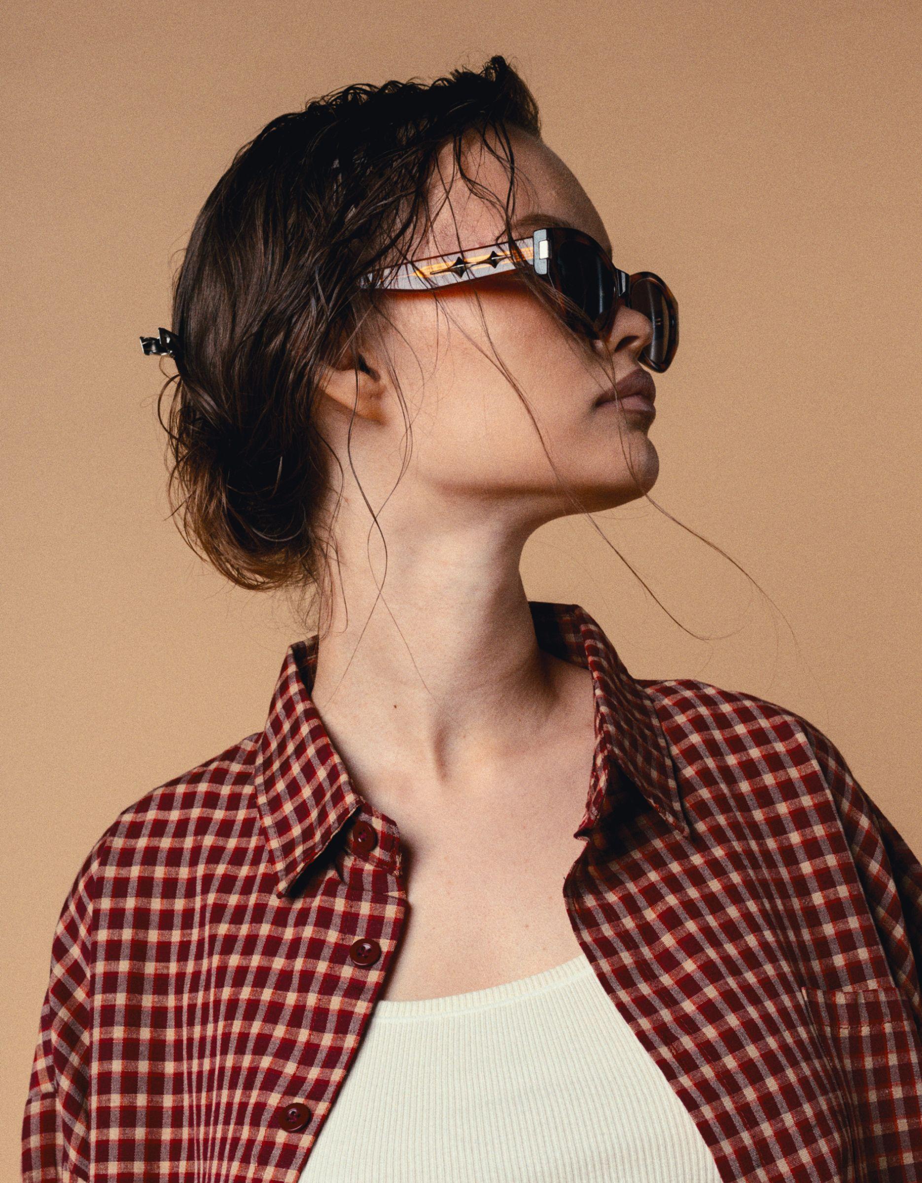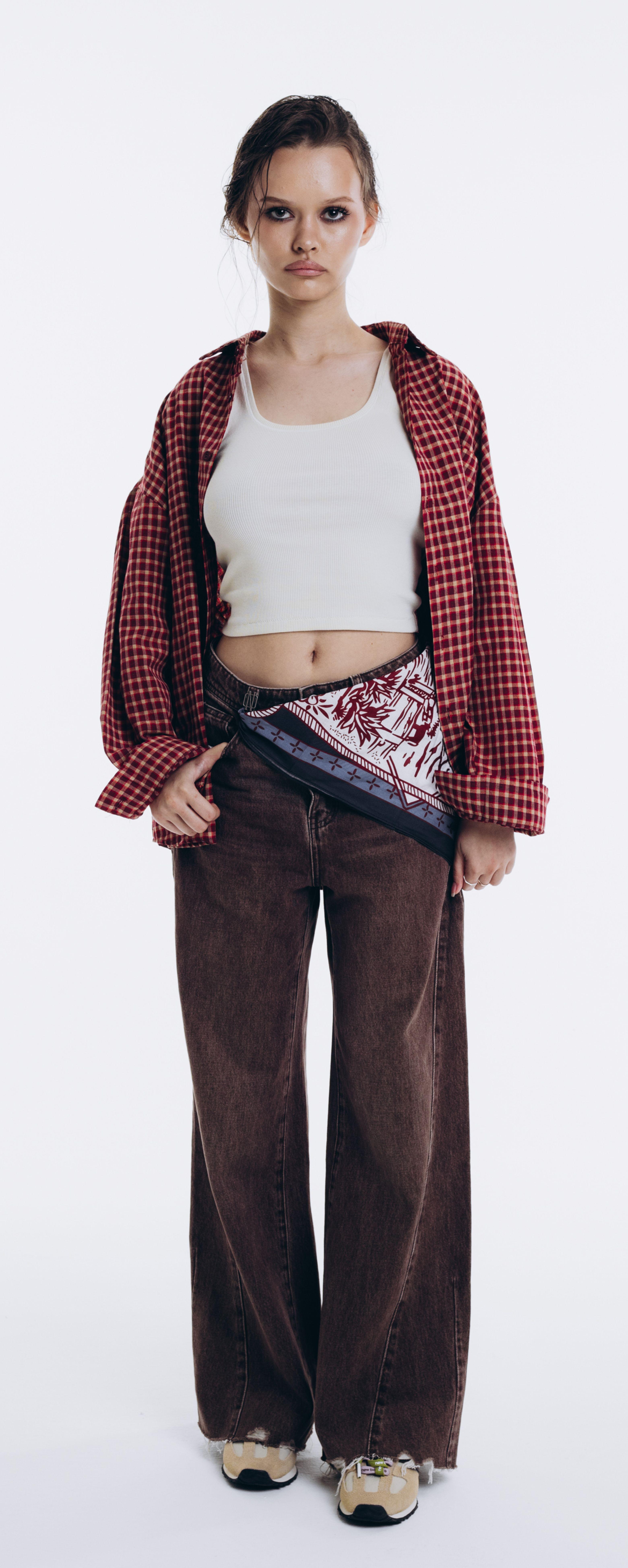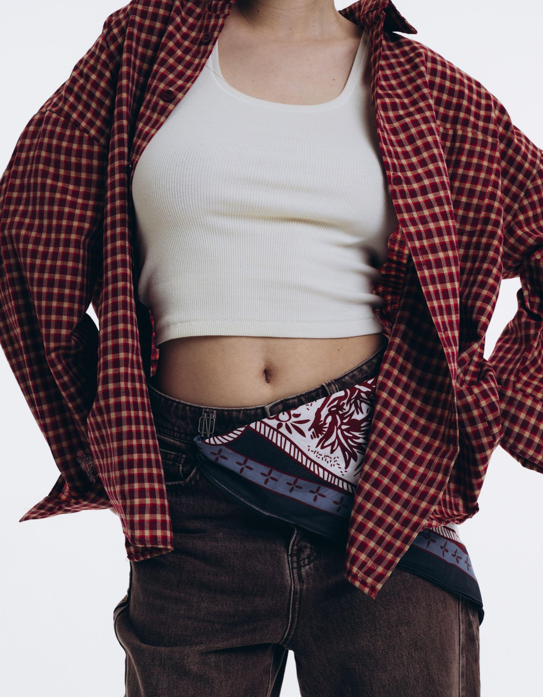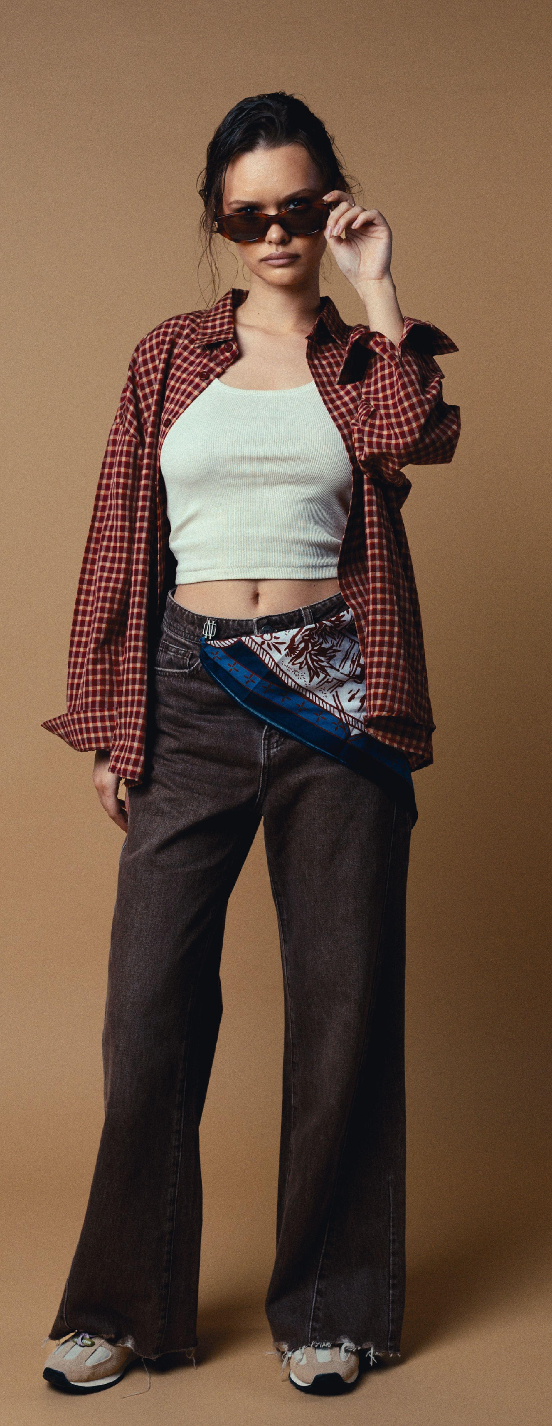 Оверсайз рубашка в клетку, топ Skims и расклешённые джинсы с эффектом лёгкой небрежности. Платок на поясе настраивает на летний вайб, а кроссовки говорят: «Я готова к прогулке хоть прямо сейчас».