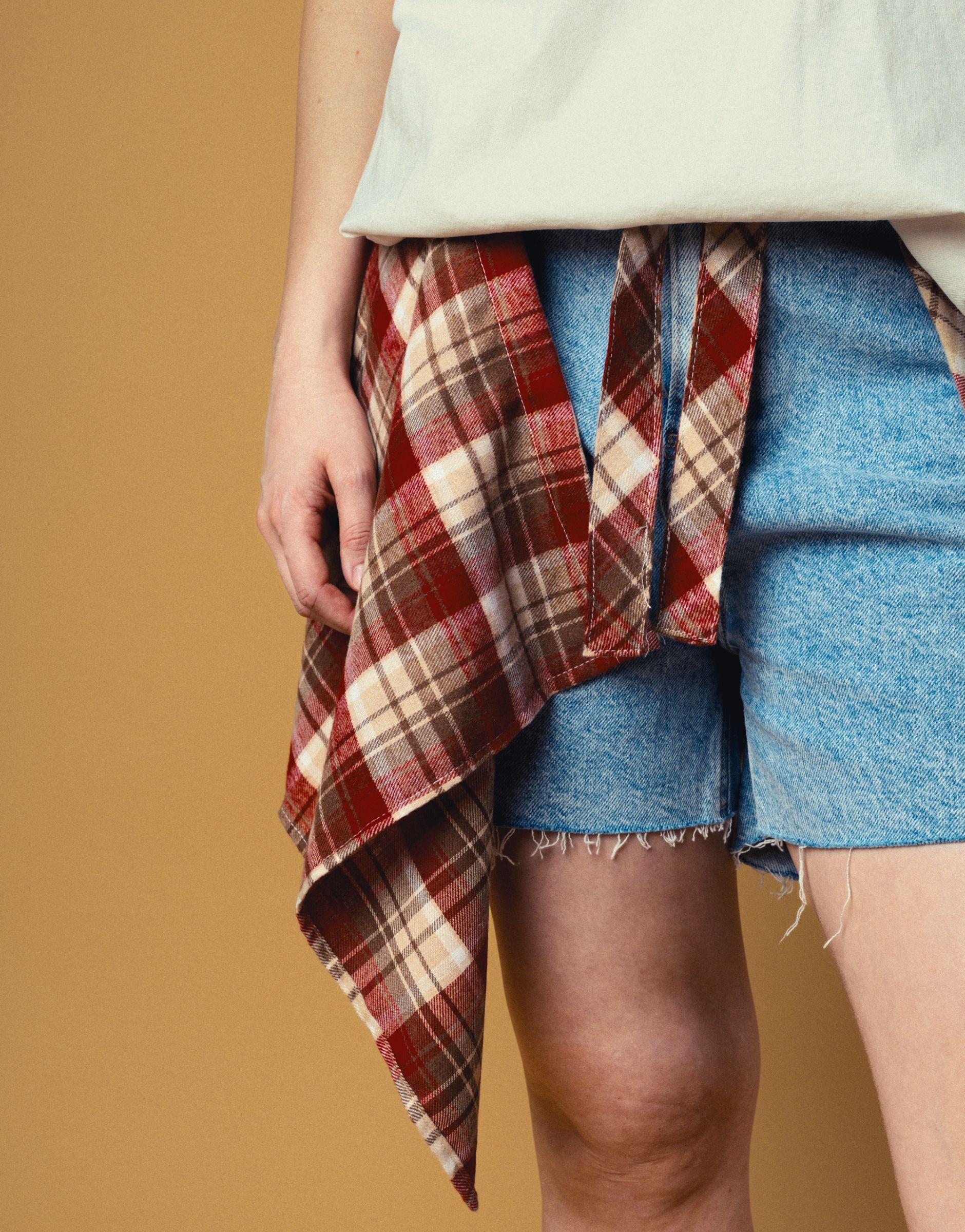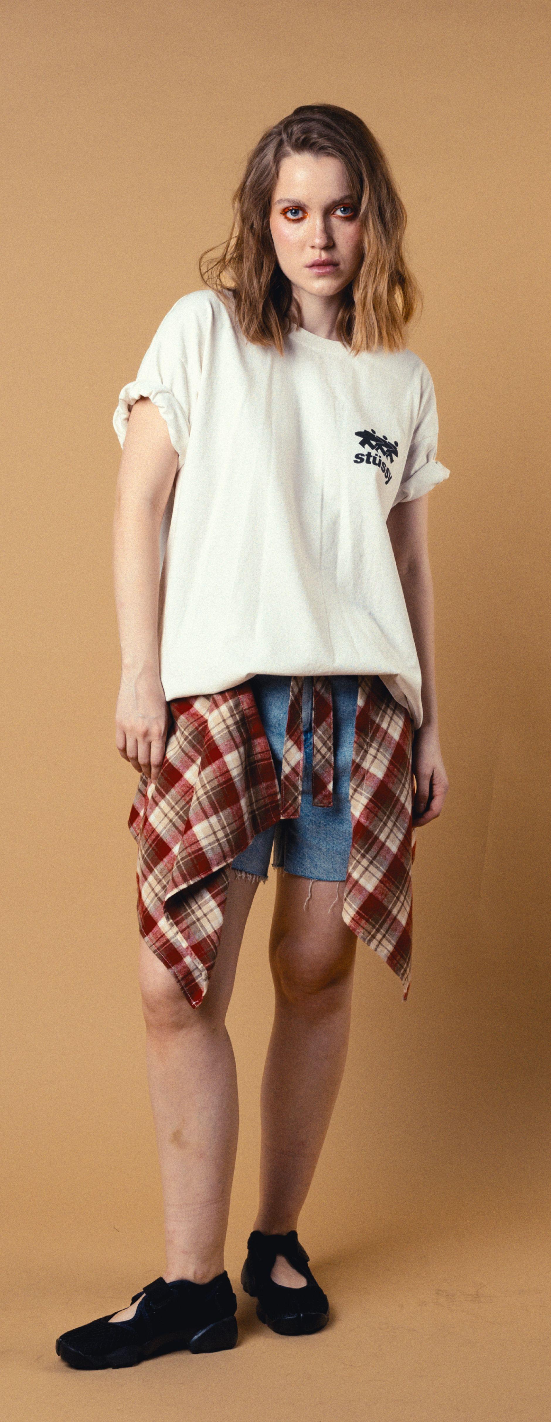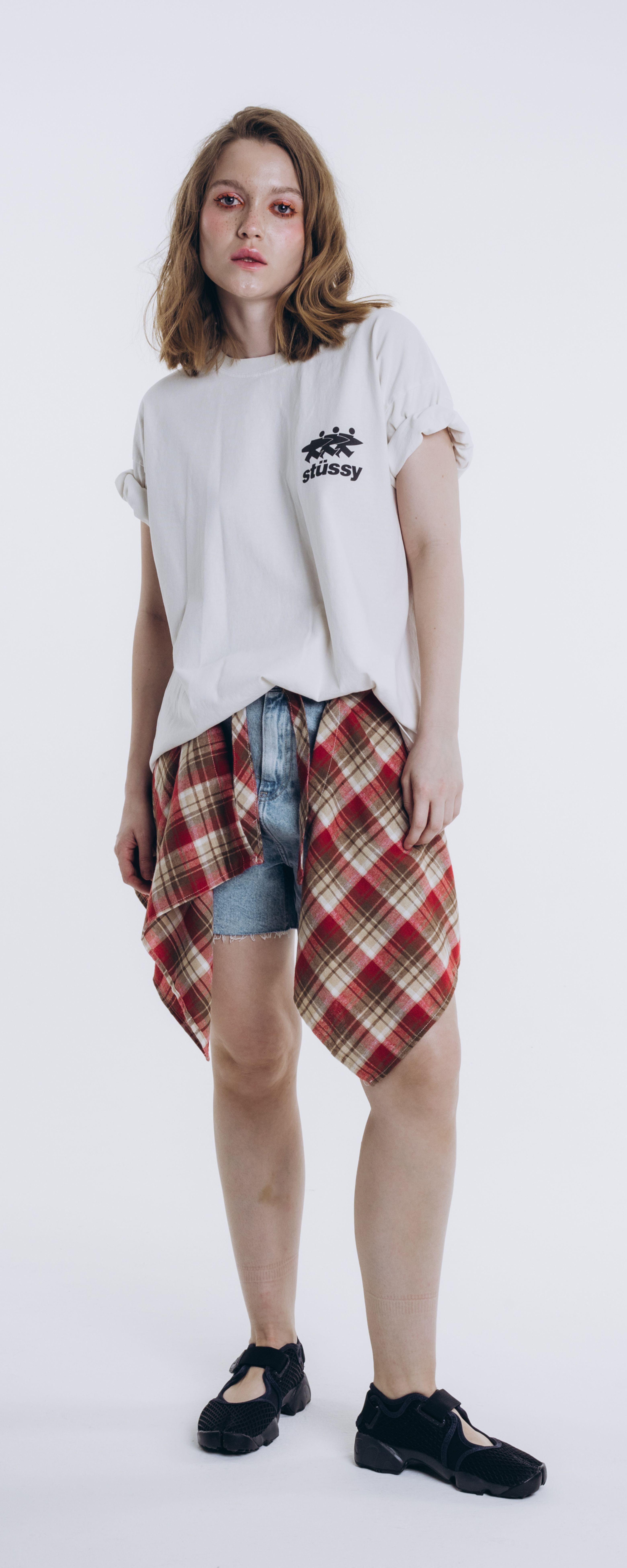 Старая школа с новой подачей: клетчатая повязка на поясе, деним и Stüssy. Уютная агрессия для тех, кто играет по своим правилам.