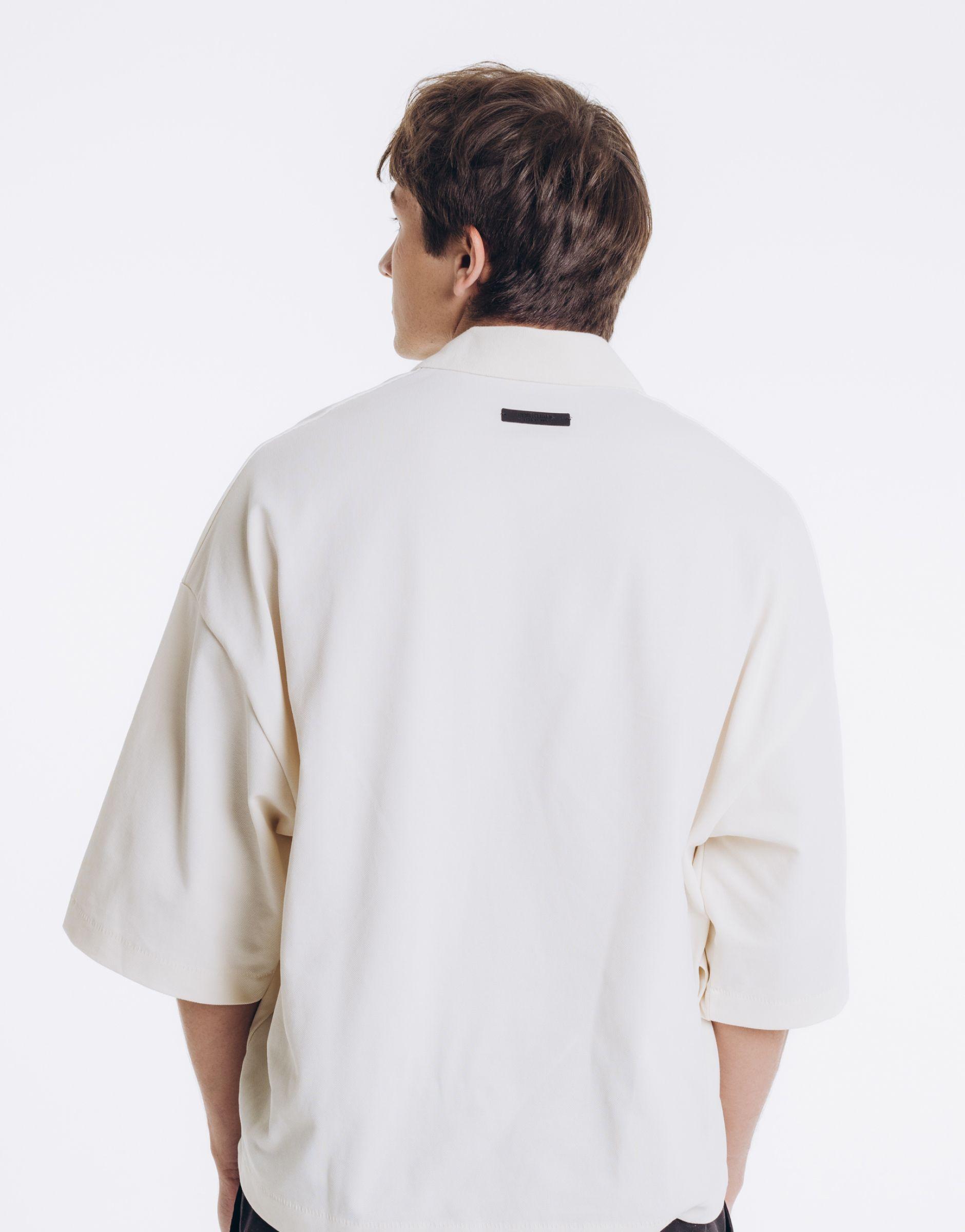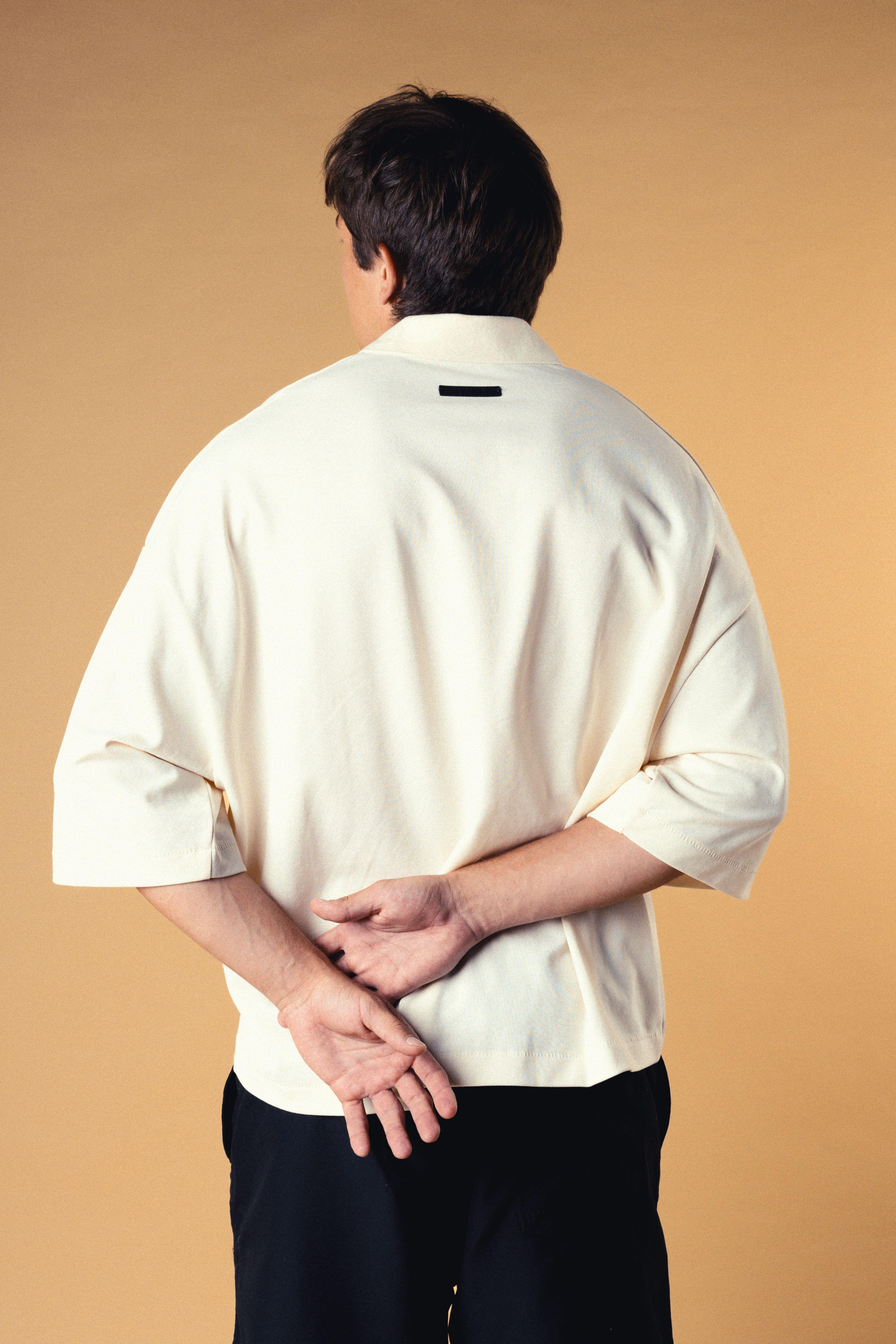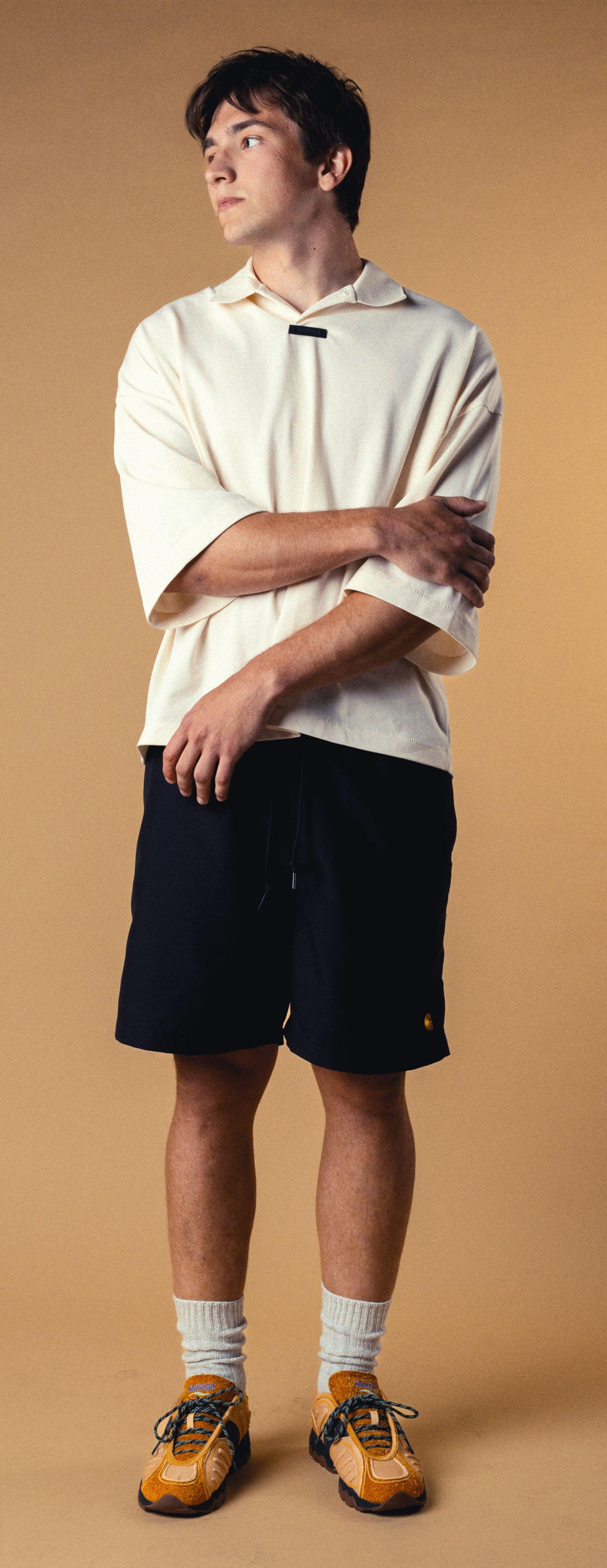 Объёмное кремовое поло Essentials, свободные шорты Carhartt и акцентные Saucony Matrix. Тот случай, когда базовый аутфит выглядит на уровне.