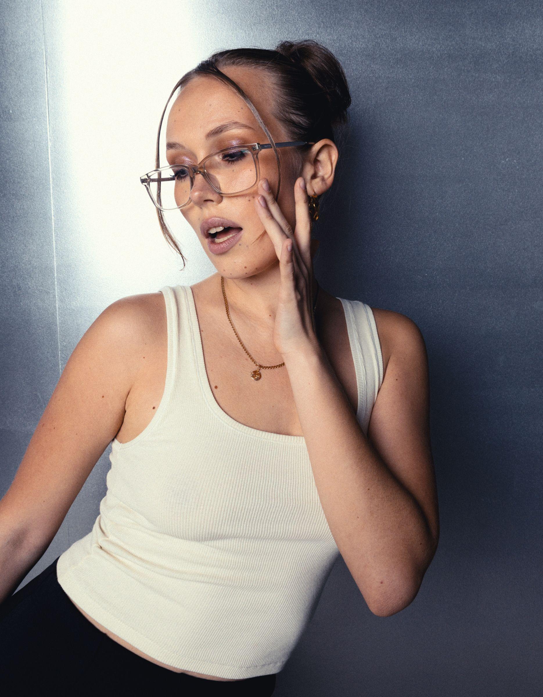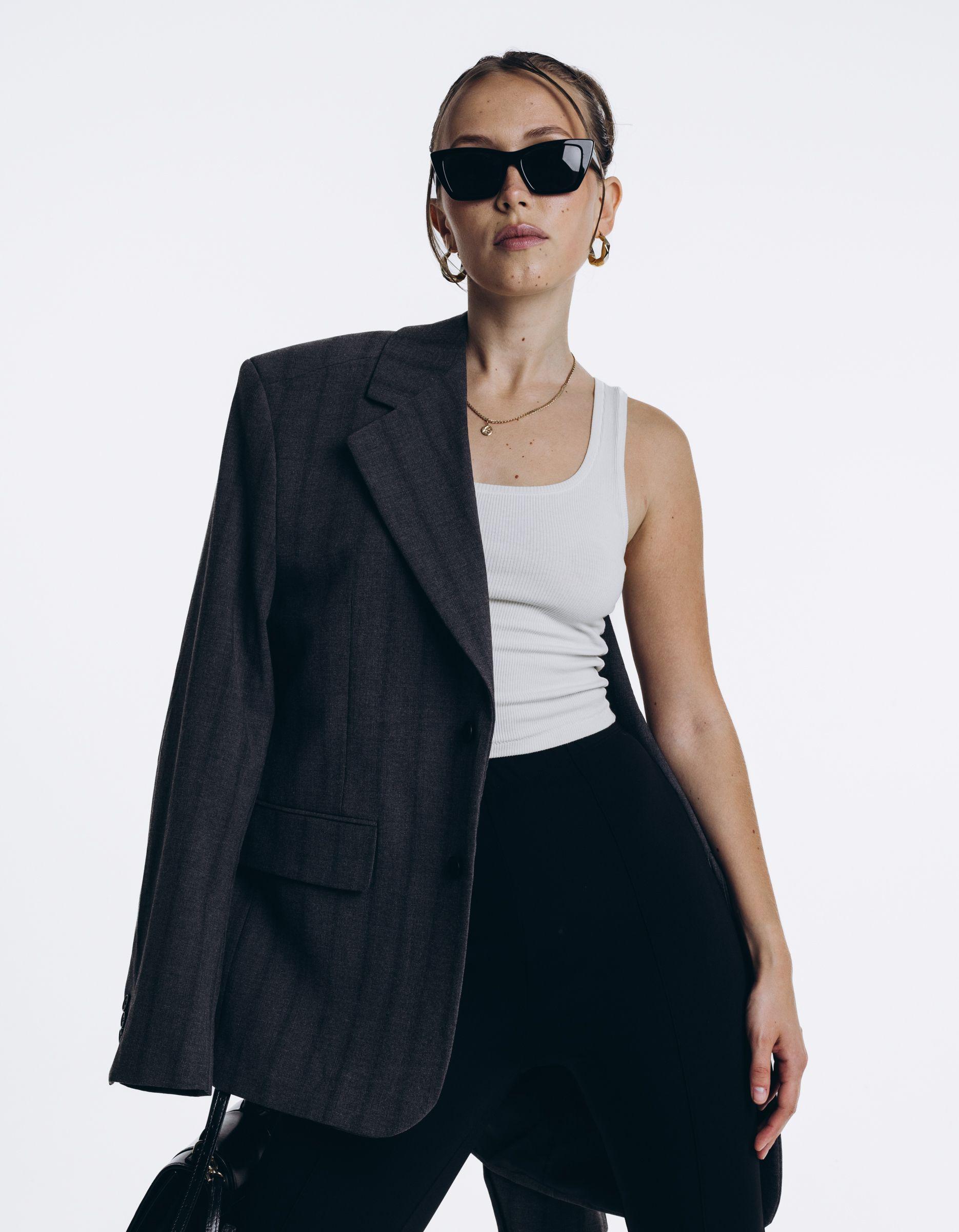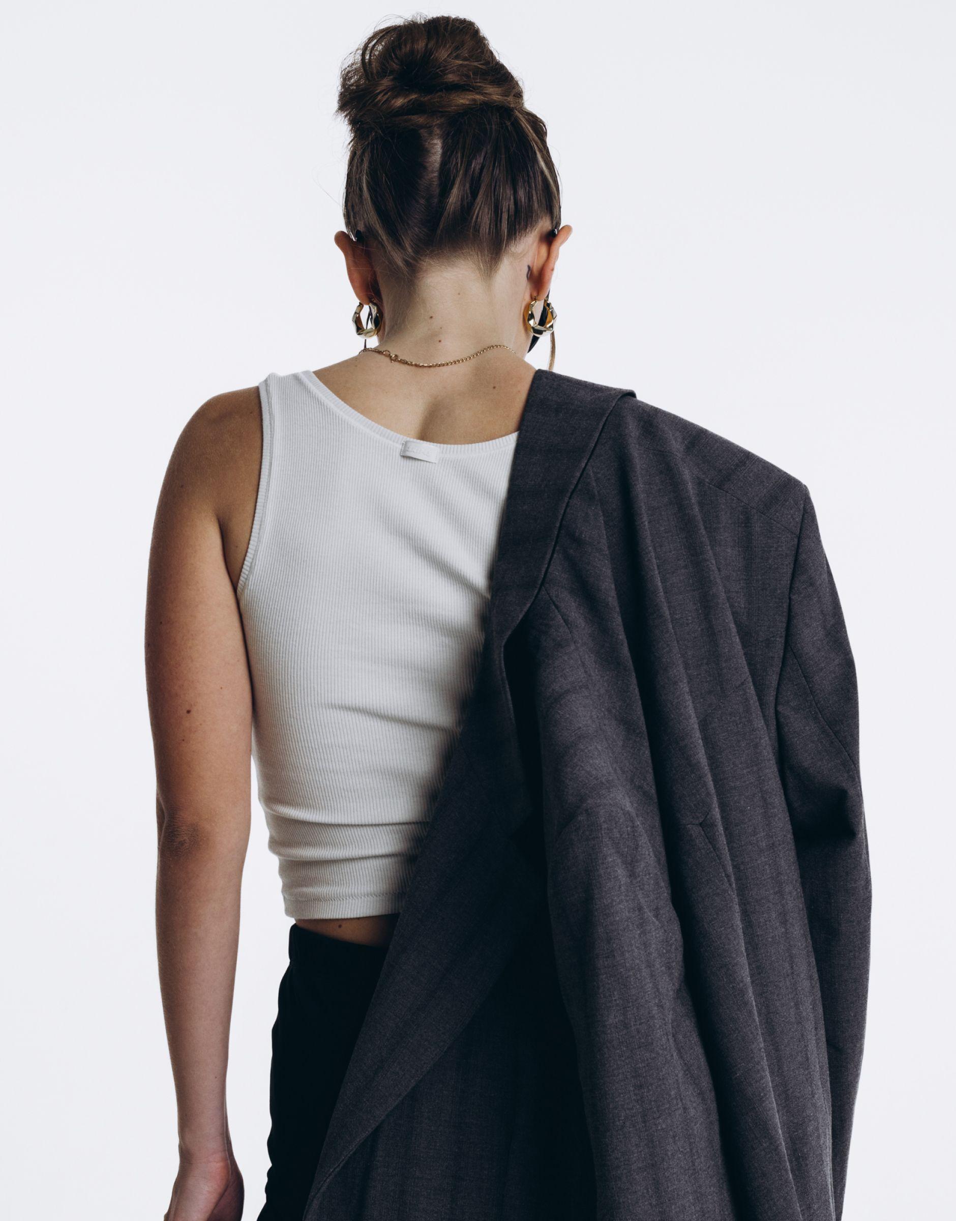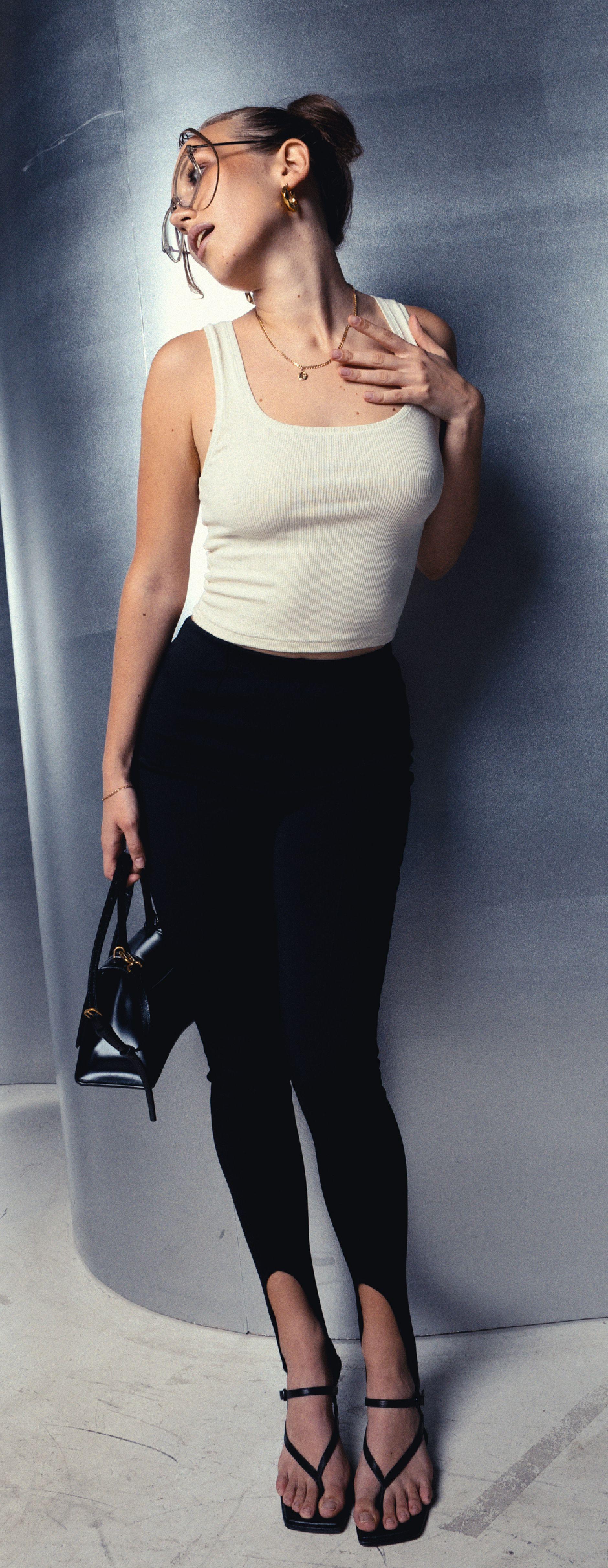 Чистый городской шик: белый топ Skims, оверсайз пиджак наброшен на плечо, строгие легинсы в сочетании с мюлями. Лёгкий намёк на драму и уверенность на максимуме.