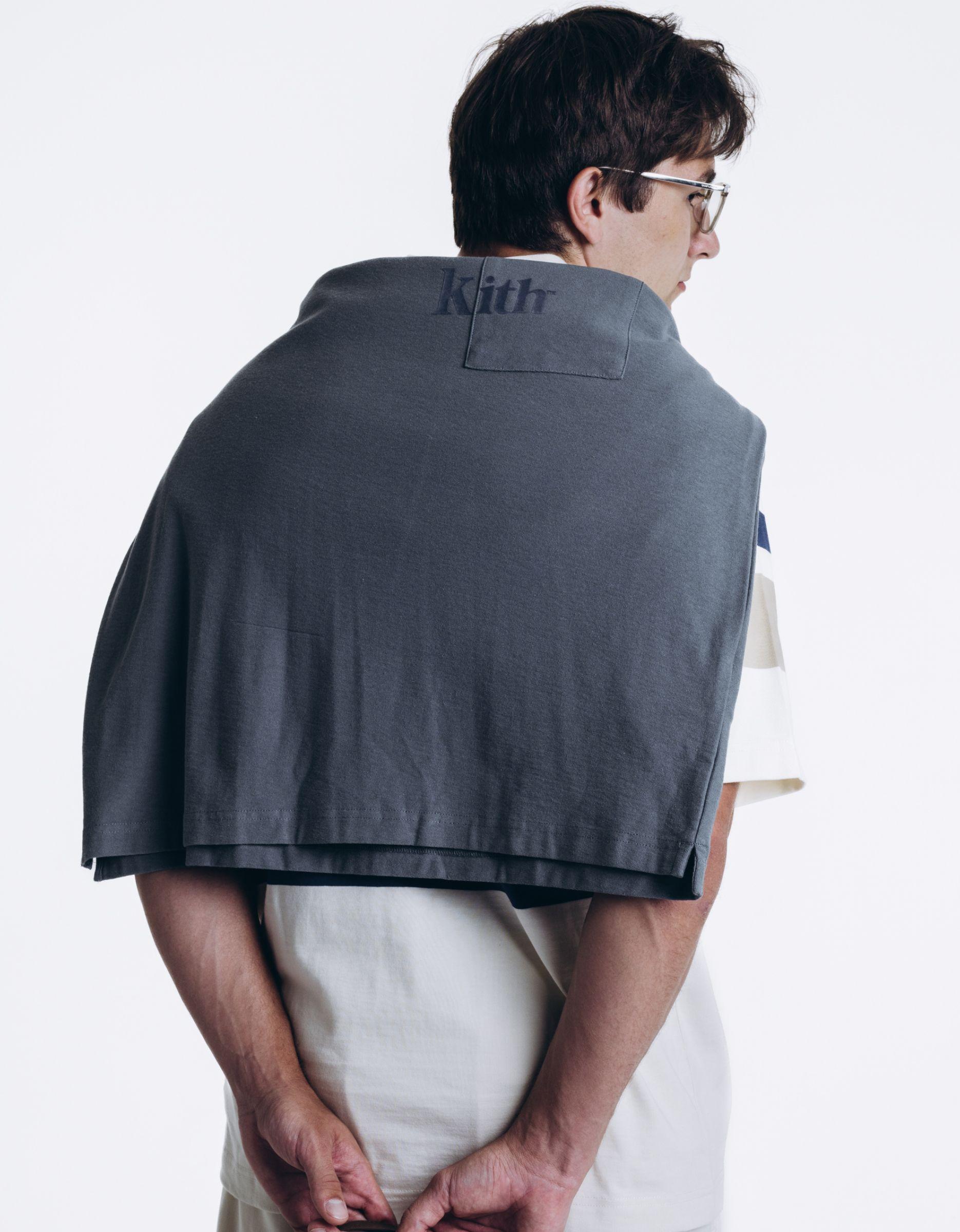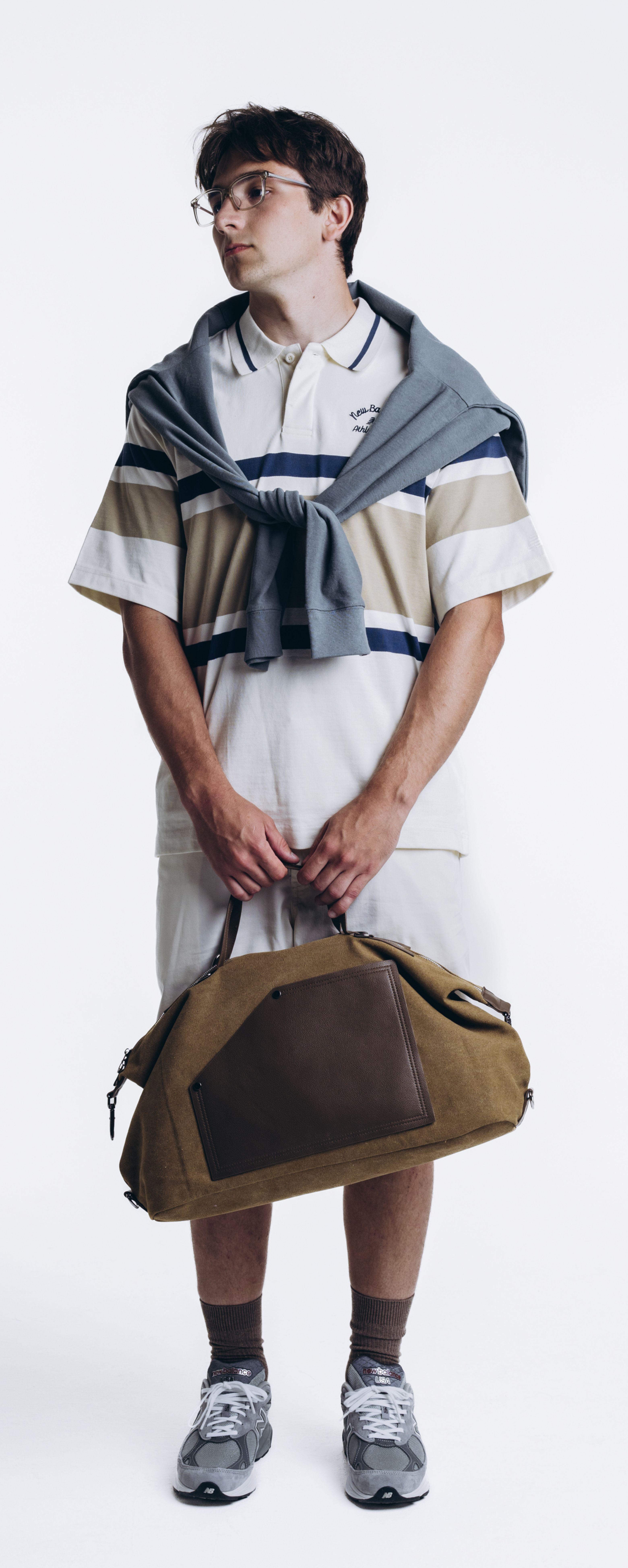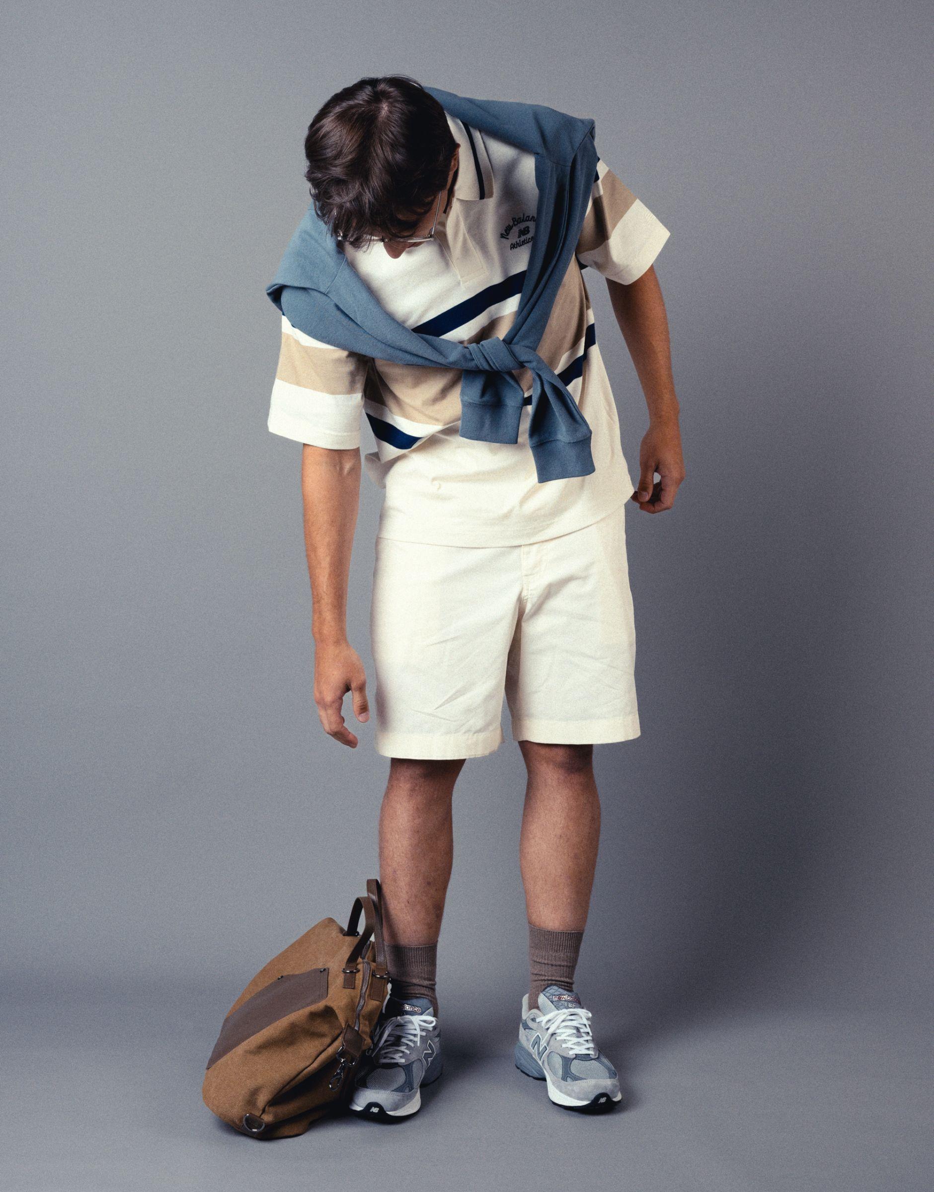 Легкий отпускной вайб: полосатое поло от New Balance, строгие шорты и джемпер Kith на плечах. В руках - дорожная сумка, будто ты только что вышел из такси у отеля нового города.