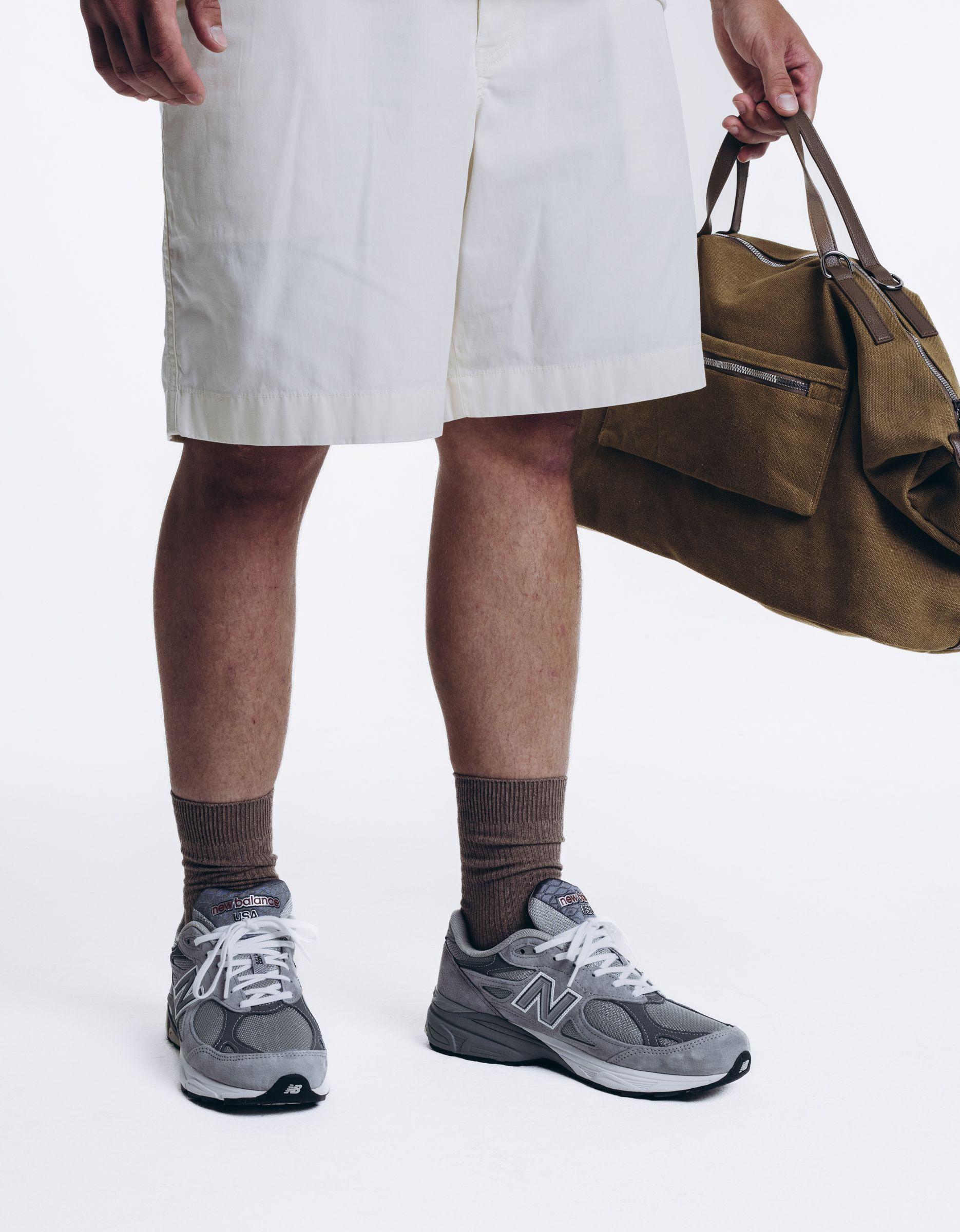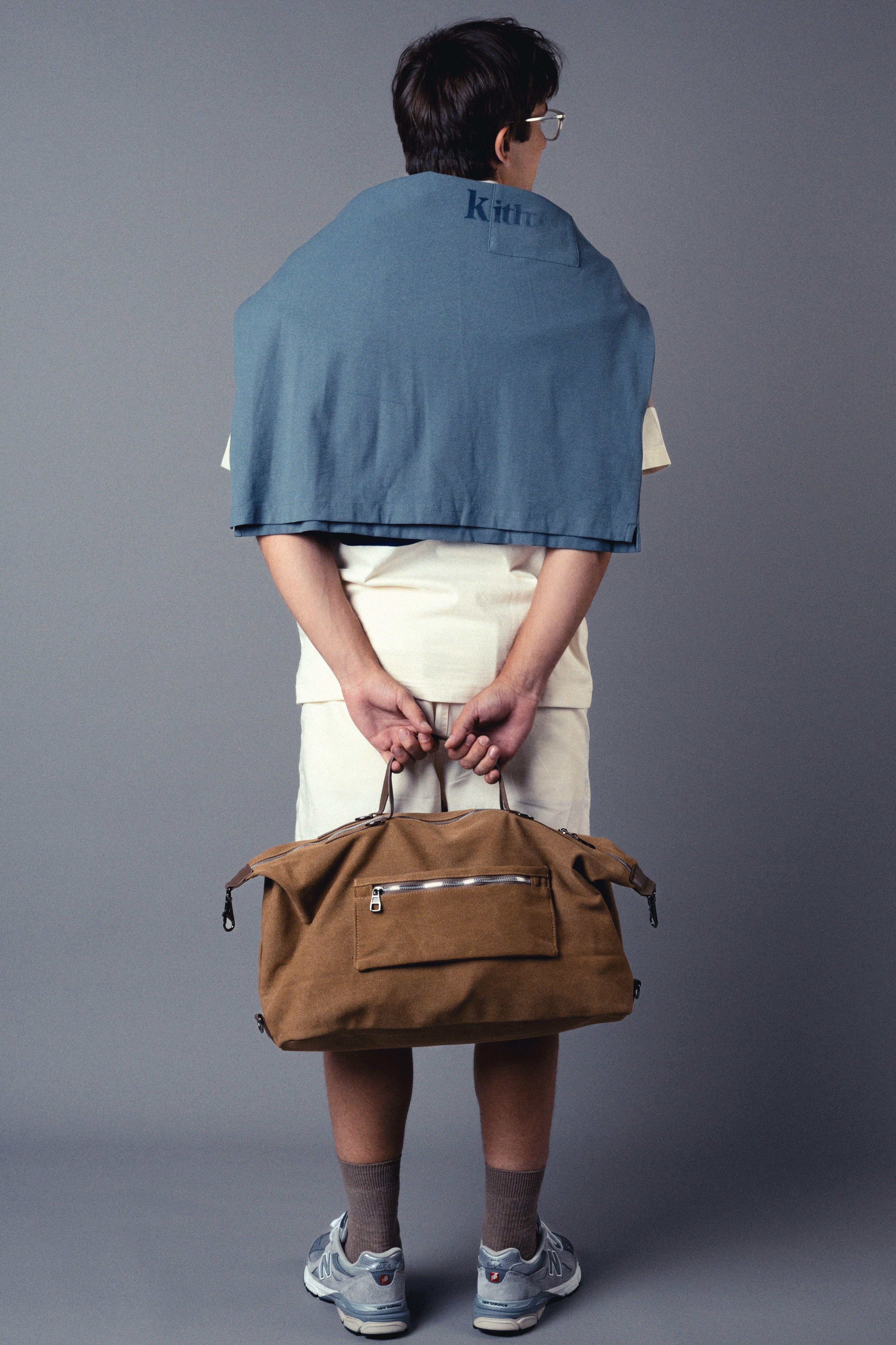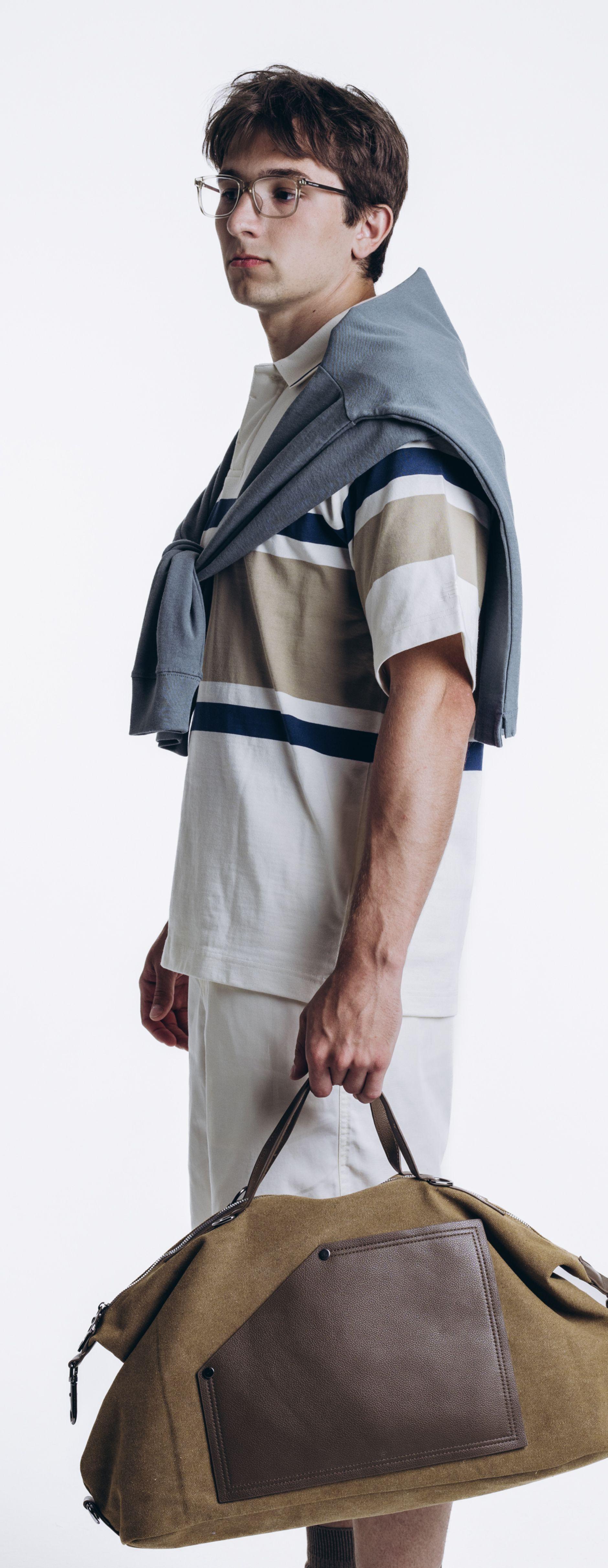 Легкий отпускной вайб: полосатое поло от New Balance, строгие шорты и джемпер Kith на плечах. В руках - дорожная сумка, будто ты только что вышел из такси у отеля нового города.