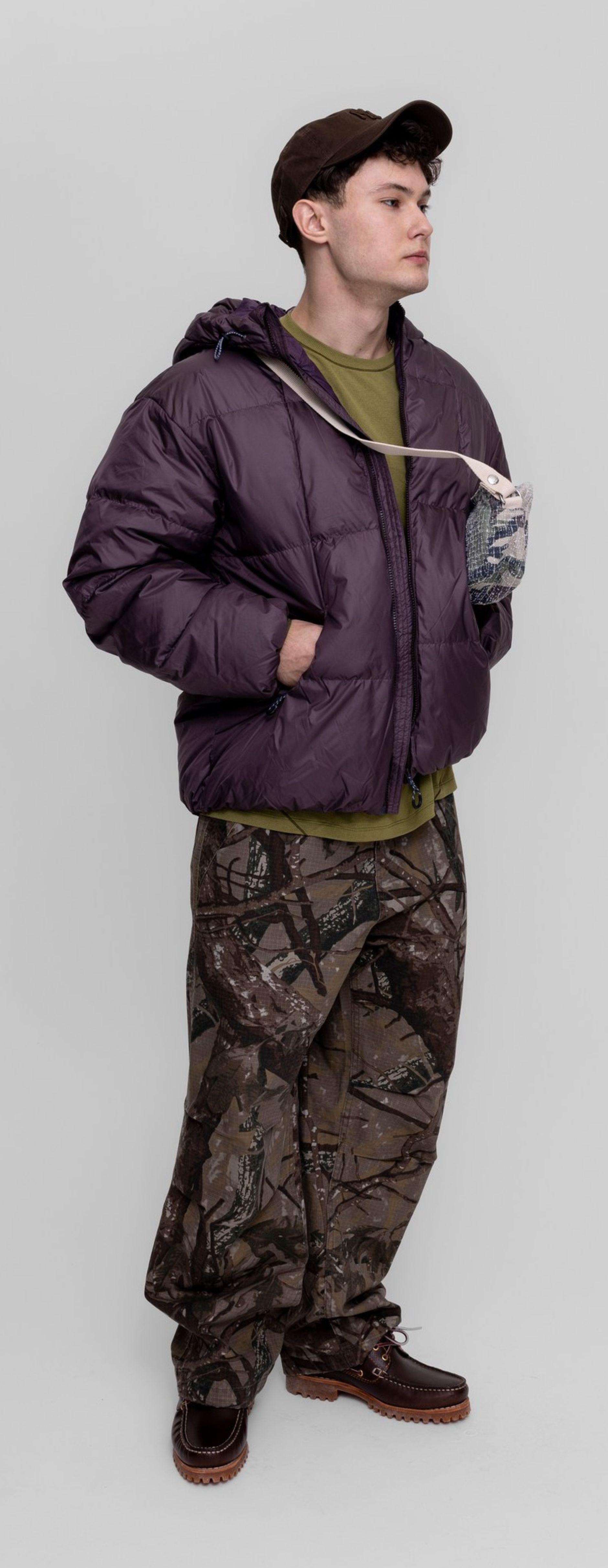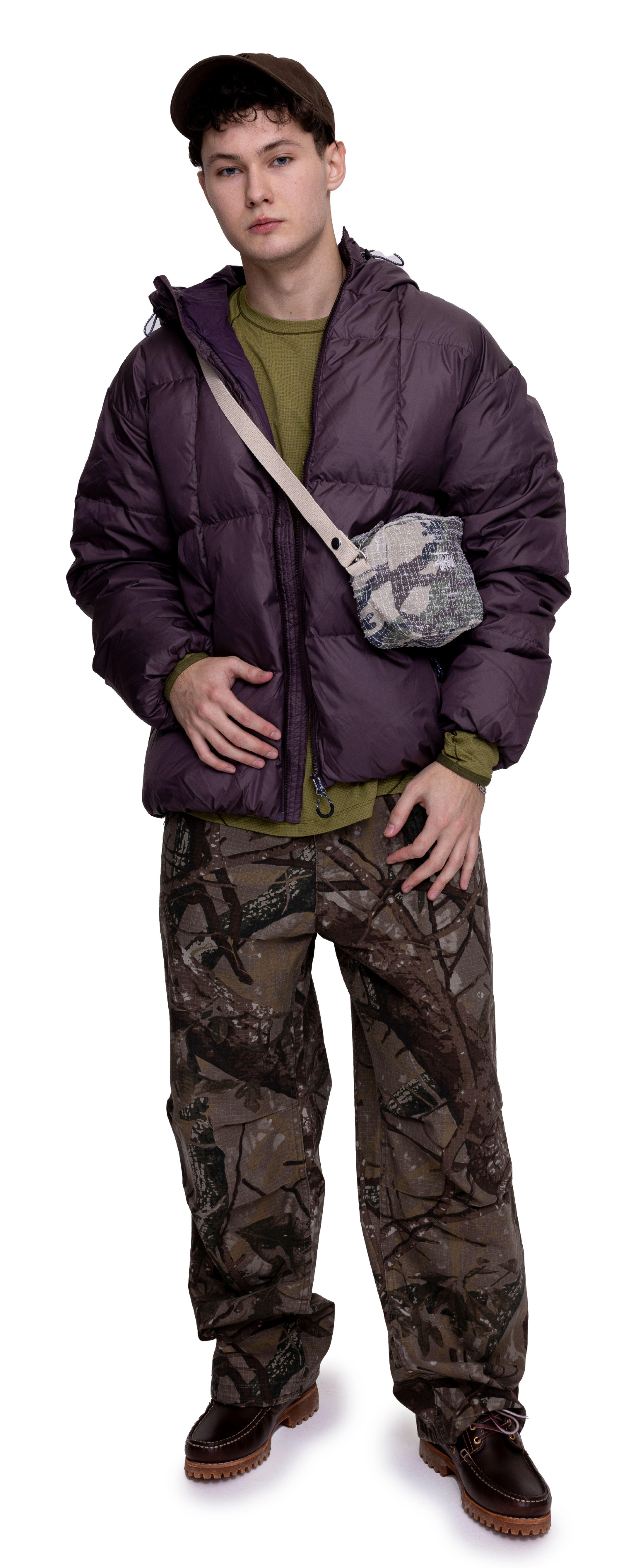 Образ создан для смелых и активных. Утеплённый пуховик в приглушённых тонах идеально сочетается с камуфляжными брюками, создавая эффект «готов ко всему». Такой образ особенно актуален для прогулок в холодное время года, поездок на природу или городских приключений. Минималистичная сумка через плечо и бейсболка дополняют сет, делая его универсальным для повседневной жизни.