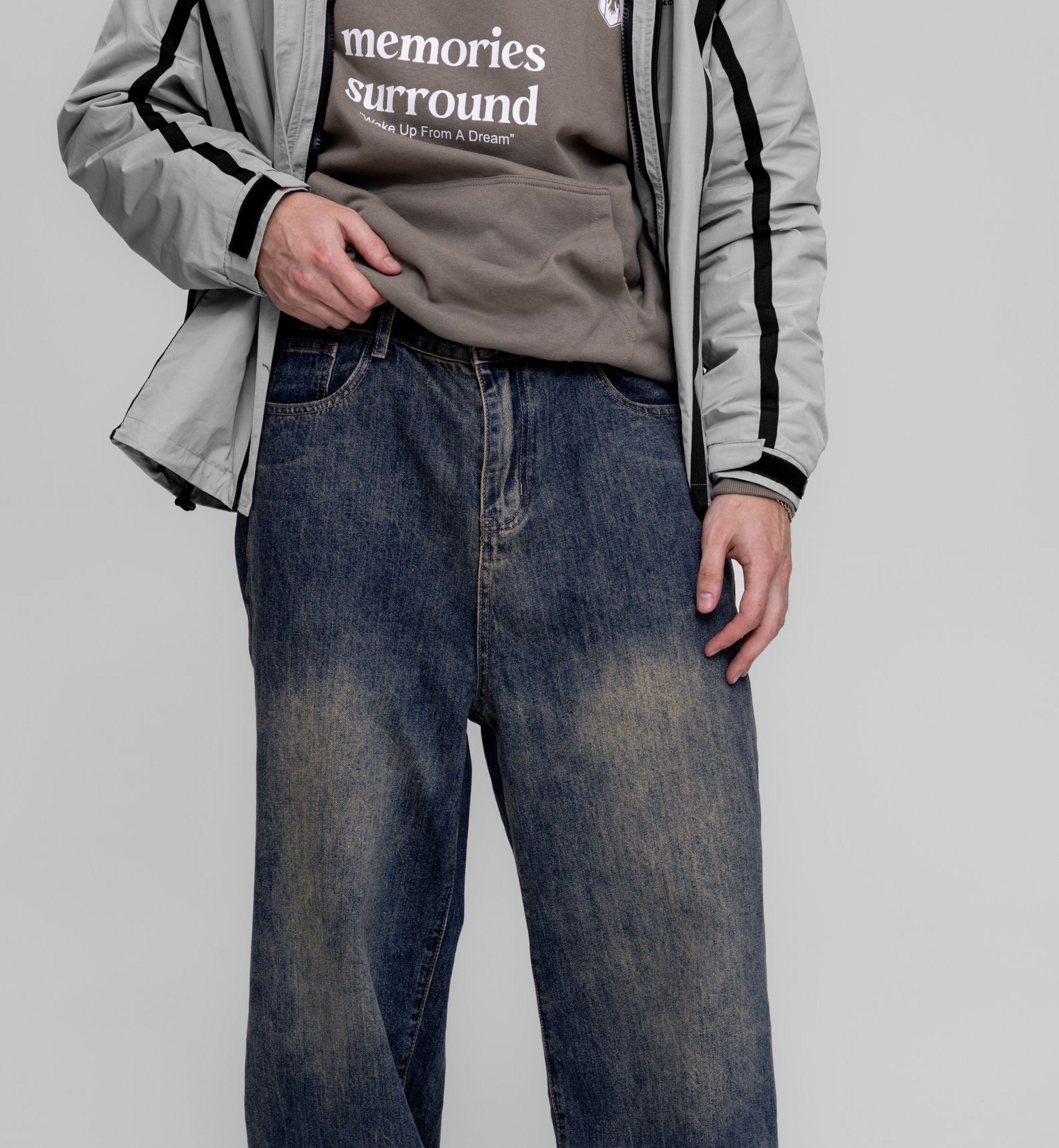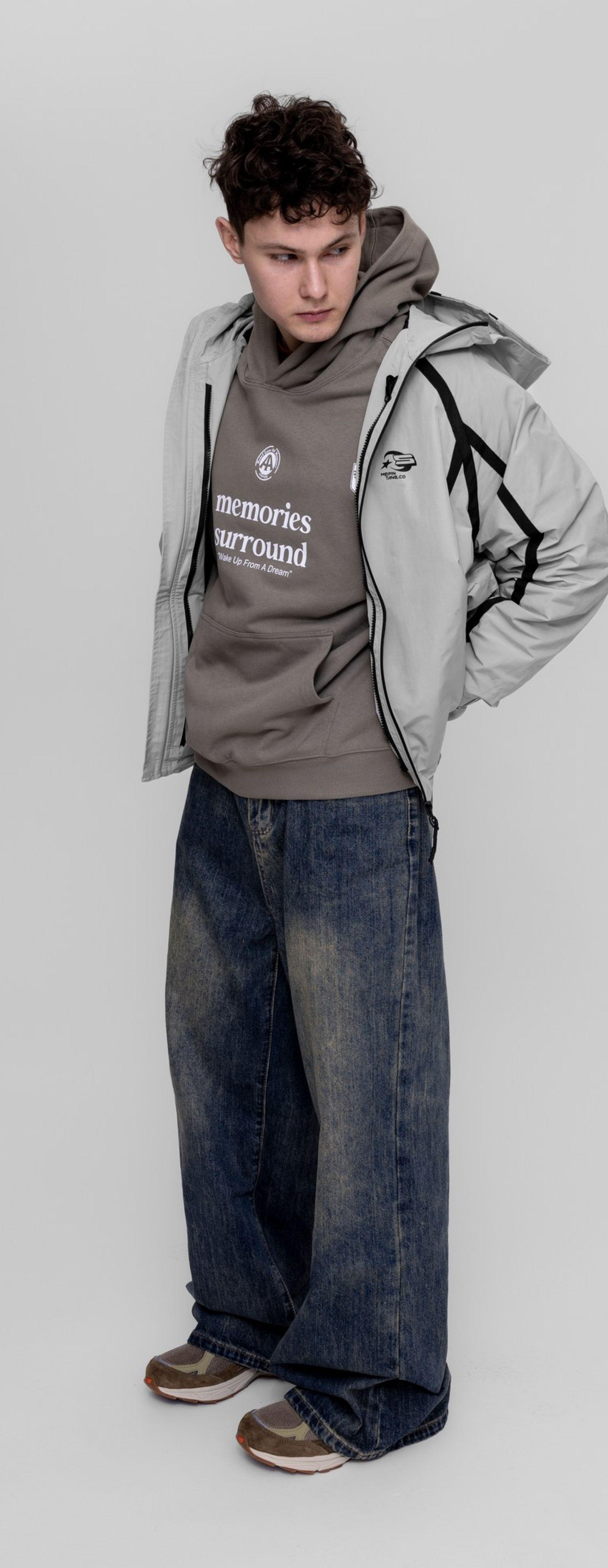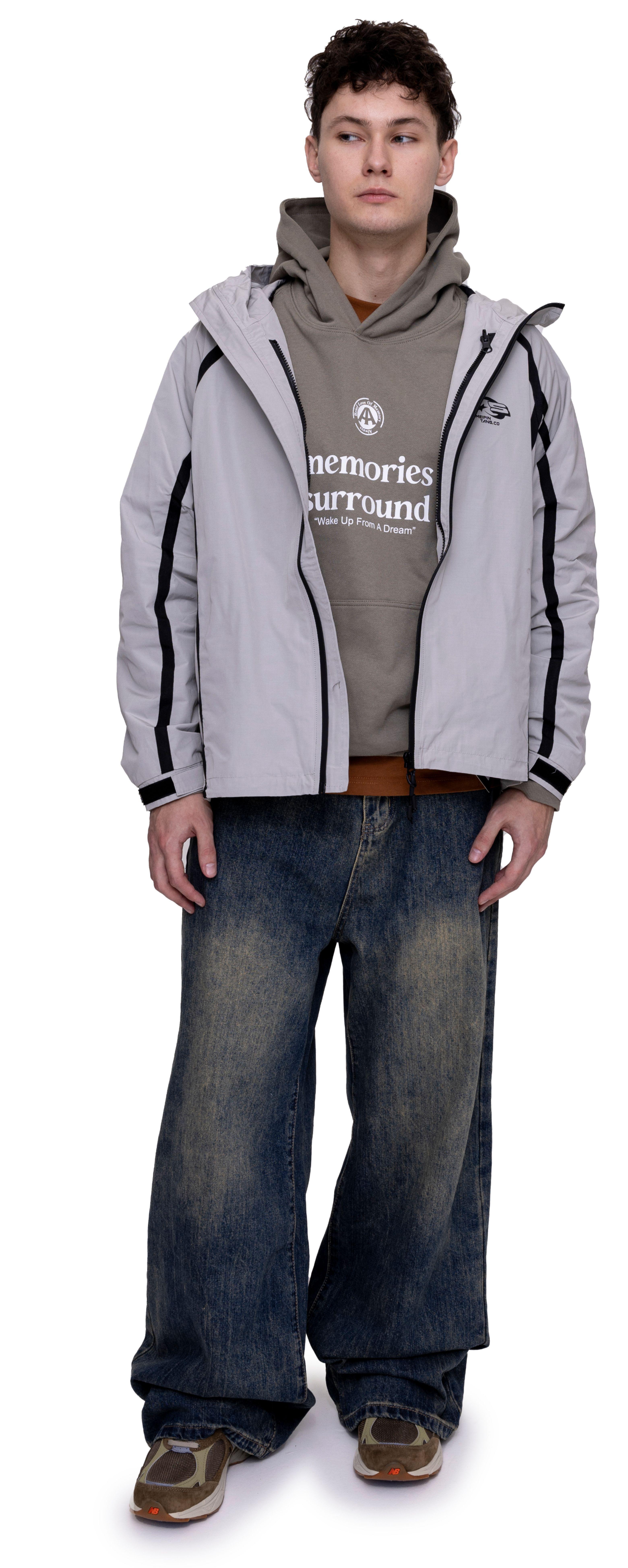Светло-серый ветровка в сочетании с широкими джинсами создаёт атмосферу 90-х. Удобные кроссовки завершают этот сет, делая его подходящим для прогулок или встречи с друзьями.